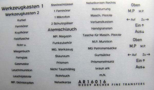 Enthalten sind über 40 beschriftungen in schwarz für Teilebeschriftungen wie Werzeugkasten, Handgranaten, Atemschlauch, fernörer, usw. usw.
