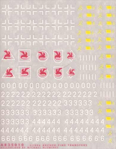 Als Reibebilder sind die "Drachen" in den verschiedenen geometrischen Formen, je nach Zug der 6,Kp, sowie entsprechende Balkenkreuze, Divisionsabzeichen und haufenweise kleine, weisse Zahlen zum Markieren der Panzer.