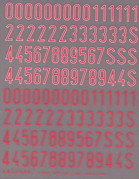 Das Set enthält etwa 10mm hohe Ziffern von 0 bis 9 und den Buchstaben 'S', jeweils in den damals üblichsten Farben rot mit weisser Umrandung und einfach rot ohne Umrandung.
