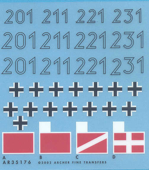 Die Serie von Dry Transfers (AR35175 bis AR35177) befasst sich mit den Markierungen der Ferdinands der schweren Panzerjägerabteilung 653. Jeder Bogen deckt die 12 Fahrzeuge der entsprechenden Kompanie ab, insgesamt ist der Bau von jeweils vier Fahrzeugen pro Kompanie möglich. Als kleinen Service haben die Entwickler von Archer sorgfältig die vorhandenen Original Fotos ausgewertet und geben für je vier Fahrzeuge pro Kompanie die exakten Farbschemen der Tarnung an!