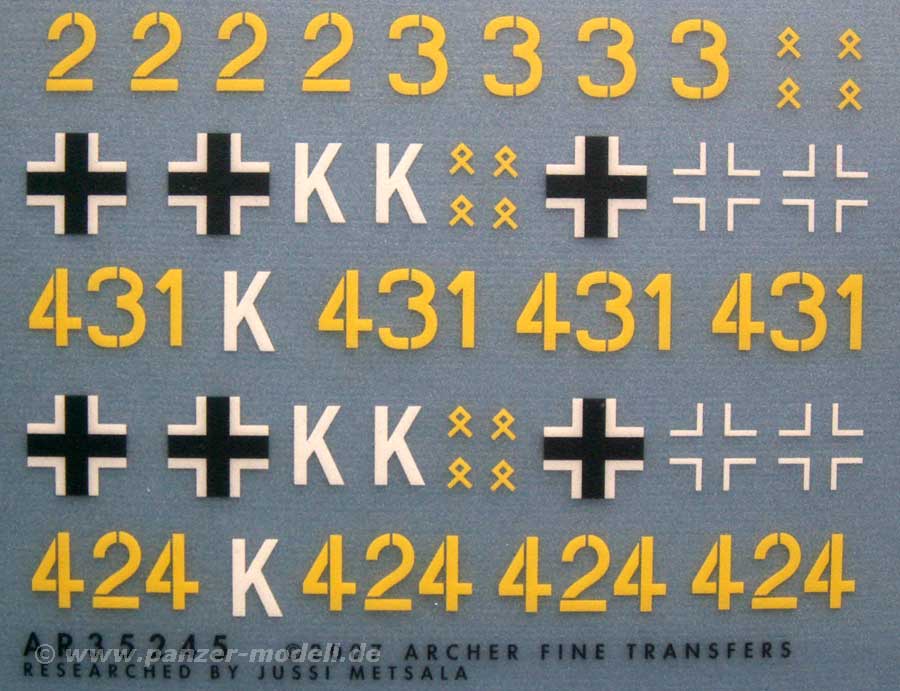 Der F1 bekommt die Turmnummer 431, der F2 die 424, welche beide in gelb gehalten sind. Dazu gibt es jeweils zwei Sorten Balkenkreuze, die Abzeichen der 14.Pz:Div. und den weißen Buchstaben "K" für die Panzergruppe Kleist.