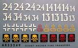 Enthalten sind Balkenkreuze in weißer Umrandung, das Abzeichen der StuG Abt.226 und das taktische Zeichen - beide jeweils in rot und gelb, je nach Batterienummer, sowie weiße Nummern für die Geschützkennung in ganz speziellem Stil.