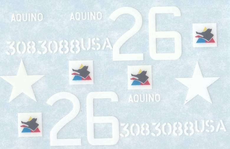 Enthalten sind die weiße Sterne, die Zahlenkombo "26" in weiß, der Spitzname 'Aquino', Identifikationsnummern des Panzers sowie die taktischen Zeichen. Die Anleitung zeigt in einem farbigen Druck die Lackierung und die Positionierung der Abzeichen in einer Seitenansicht. Ferner gibt es noch ein kleines Photos des Originalfahrzeuges.