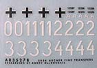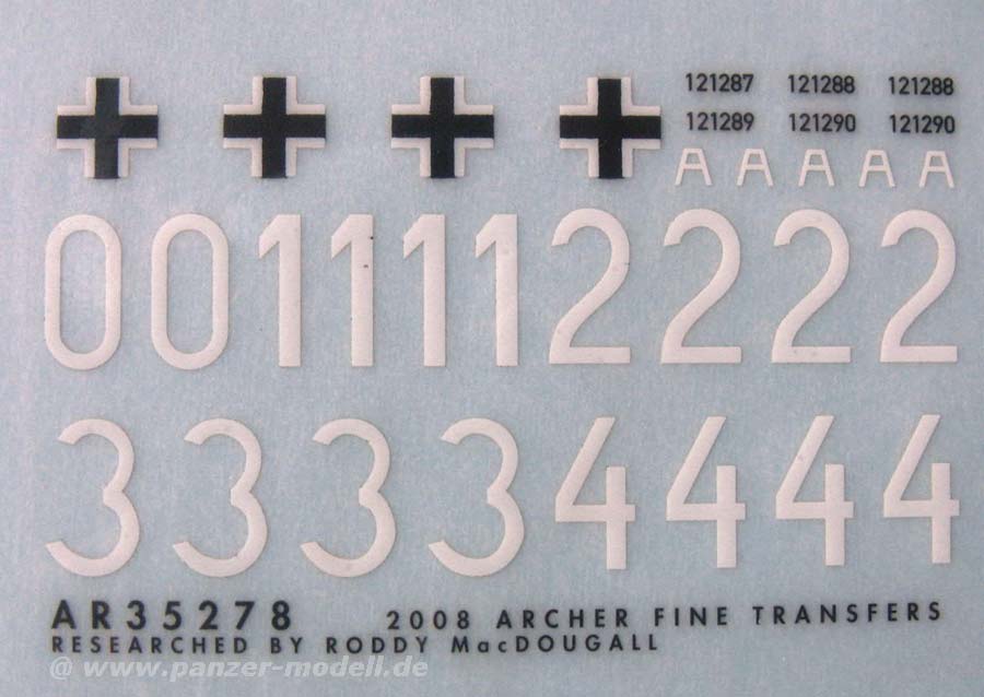 Dieses Set hat vier Balkenkreuze, sowie ein Satz weisse Ziffern von 0 bis 4 (bis auf die '0' jeweils 4x vorhanden), kleine, weiße 'A's, sowie vier winzige, schwarze Fahrgestellnummernnummern (121287, 121288, 121289, 121290).