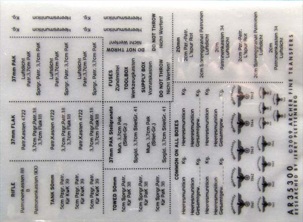 Enthalten sind massig Trockenreibebilder für Munitionskisten für Gewehrmunition, 20mm Munition, 37mm Flak, Pak und Panzer-Munition und 50mm Munition.