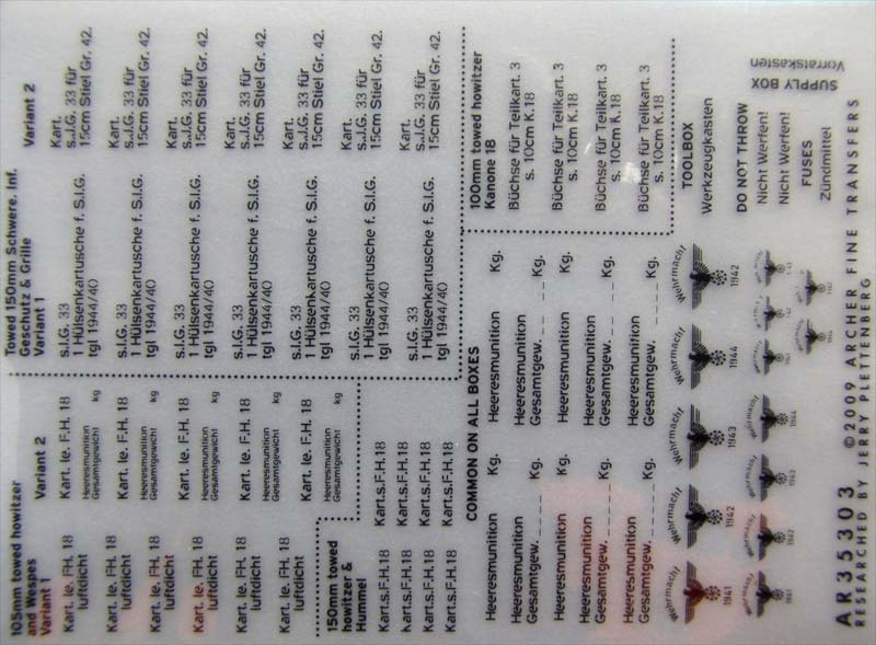 Enthalten sind haufenweise Trockenreibebilder für Munitionskisten für die 100mm, 105mm und 150mm. Die 100mm sind für die gezogene K18, 105mm in 2 Varianten für die gezogene Haubitze und Wespe und die 150mm für die gezogene Haubitze, Hummel, sowie zwei Varianten für die sIG33 und Grille.