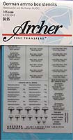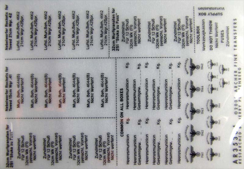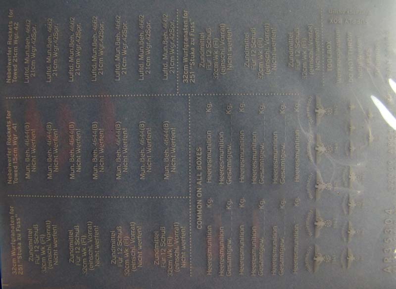 Enthalten sind viele Trockenreibebilder für Munitionskisten für die 15cm und 21cm Nebelwerfermunition, sowie für die 32cm Wurfgranaten "Stuka zu Fuß". Interessanterweise sind keine Beschriftungen für die 28cm Wurfgranaten enthalten.