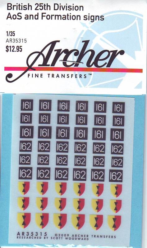 Enthalten sind die Divisionsabzeichen, sowie die Markierungen für North Irish Horse und 51st Batt. Royal Tank Regiment. In der kurzen Anleitung gibt es einen kurzen geschichtlichen Abriss zu dieser Einheit. Ferner gibt es einen Hinweis(Link), wie die Archer Fine Transfers anzubringen sind.