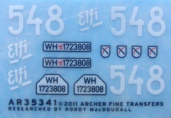 Dieses Set beinhaltet 3 "Turmnummern 548", 2 mal Nummernschilder vorn/hinten, 4x das Einheitswappen und dreimal der Schriftzug "Elfi", der spezifisch an diesem Sd.Kfz.250/9 der 6.Panzerdivision zu finden war.