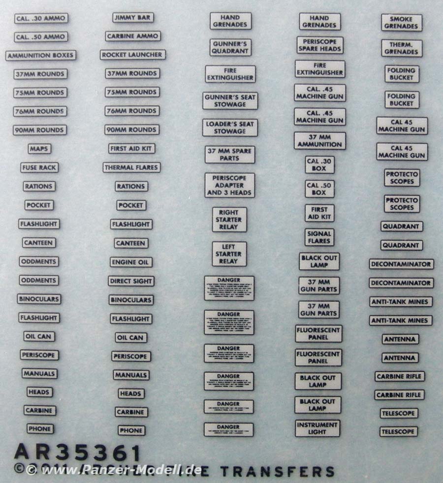 Wie schon für die deutschen Panther und Tiger gibt es nun auch für amerikanische Panzerfahrzeuge des 2.Weltkrieges bis zu modernen Fahrzeugen Trockenreibemarkierungen für die Markierungen interner Gerätschaften.