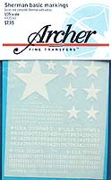 Dieser recht große Bogen mit Trockenreibemarkierungen beinhaltet alle Markierungen, die man für eienn Sherman im Maßstab 1:35 benötigt plus diverser Extras.