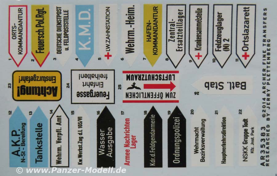 Insgesamt finden sich 23 Schilder mit den unterschiedlichsten Hinweisen und farbkombinationen. Diese sind in der Hauptsache für Dioramen mit Wehrmachtsbezug. Aber auch zivile Schilder für Straßen/Orte sind enthalten wie etwa ein Schild für eine Feuergasse oder "Achtung Einsturzgefahr".