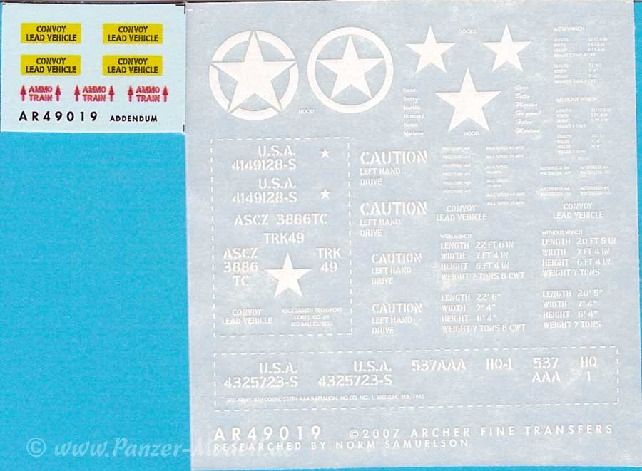 Das Set 49019 beinhaltet Abzeichen für den US 2,5 ton 6x6 Truck in 1/48