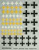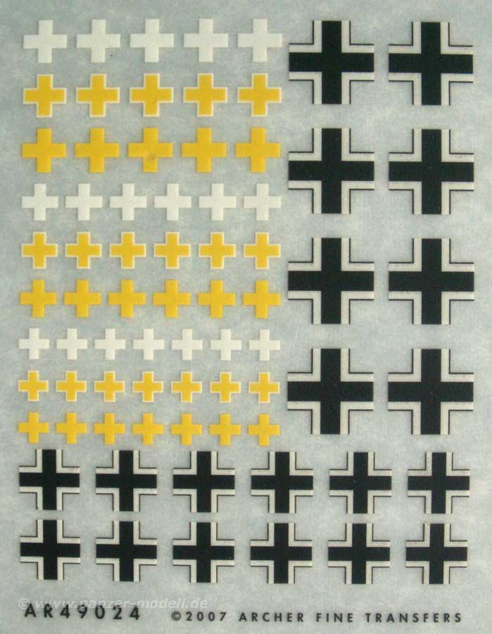 Das Set 49024 beinhaltet German WWII Balkenkreuze in 1/48Enthalten sind verschiedene Arten an Balkenkreuzen in verschiedenen Größen. Es sind 12 Balkenkreuze 8mm in schwarz/weiss, 8 Balkenkreuze 11mm in schwarz/weiss, je 5 Kreuze 6mm in weiss, gelb und gelb mit schmalem weissen Rand, je 5 Kreuze 5mm in weiss, gelb und gelb mit schmalem weissen Rand und je 5 Kreuze 4mm in weiss, gelb und gelb mit schmalem weissen Rand. Mit diesem Set ist man für lange Zeit mit passenden Balkenkreuzen versorgt, die sauber gedruckt sind und sich einfach auftragen lassen ohne glänzende Ränder. |