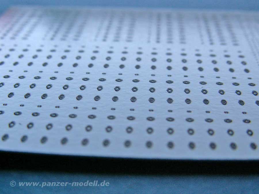 Diese können simpel vom Bogen ausgeschnitten werden, in Wasser aufgeweicht und auf das UNBEMALTE Modell aufgetragen werden - ganz einfach! Nach der Bemalung des Modells hat man schöne, feine Nietenköpfe, die man in dieser Größe kaum selber machen kann.