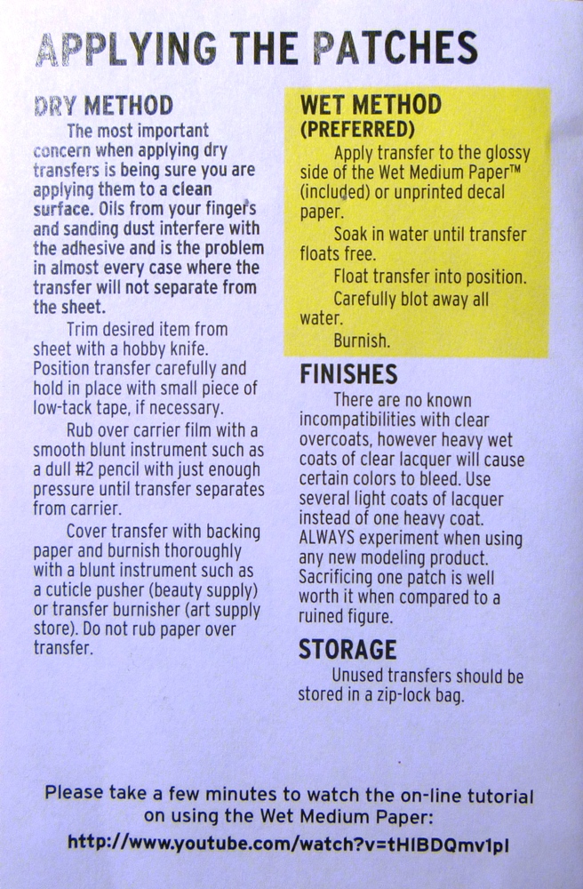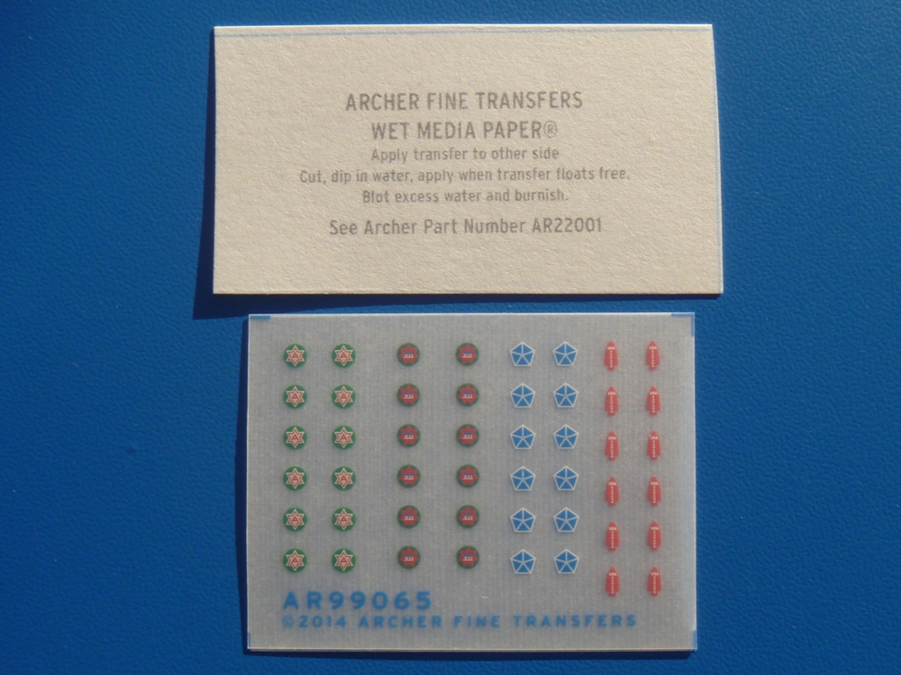 Für 1:35-er US Soldaten bietet uns Archer ein Set von je 12 Schulterabzeichen für 4 verschiedene Einheiten. Man kann sie wie folgt verwenden: - 6. US Armee: Schulterabzeichen ab 2. Weltkrieg (1943 - 1995, 2008 - heute) Die Abzeichen sind sehr fein gedruckt und werten die Figuren entsprechend auf. Ausgelegt sind sie als Trockenreibebilder, aber es liegt ein sogenanntes Wet Media Paper bei, mit dem man sie in Nassschiebebilder umwandeln kann. Die Anbringungsmethoden sowohl für Trocken- als auch Nassnutzung (Herstellerempfehlung) sind in einem Beiblatt beschrieben. Archer stellt aber auch ein fast 10-minütiges Video in Englisch zur Verfügung: http://www.youtube.com/watch?v=tHlBDQmv1pI In Deutschland sind Archer Decals im Schnitt so um die 10,00 Euro erhältlich.