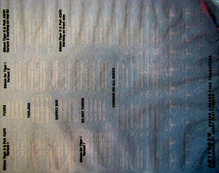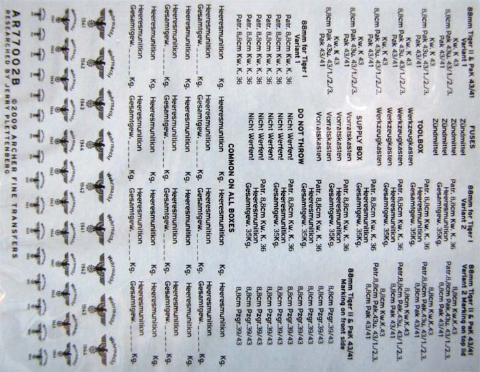 Dieses ist als 77002W mit weißer Beschriftung oder 77002B mit schwarzer Beschriftung für Munitionsbehälter für 88mm Geschütze gemacht! Beide Decalbögen beinhalten Beschriftungen und Markierungen in weißen bzw. schwarzen Buchstaben und Zahlen für die Munition und Munitionsbehälter von 8,8cm PaK43, 8,8cm für Tiger I und Tiger II in verschiedenen Versionen. Der Druck ist sehr gut, selbst die kleinsten Schriftzüge sind sehr sauber und einwandfrei lesbar gedruckt. So finden sich hier allgemeine Schriftzüge wie zum Beispiel: Nicht werfen, Zündmittel, Heeresmunition, usw.. Darüber hinaus sind 37 Reichsadler in drei verschiedenen Größen mit unterschiedlichen Jahreszahlen vorhanden. Da es sich hierbei um verfassungswidrige Abzeichen handelt, wird dieses Set in Deutschland entweder nicht oder nur in zensierter Fassung erhältlich sein. Der Kaufpreis liegt bei 6,95 US Dollar.