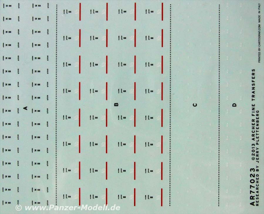 Das Decal Set AR77023 German 75mm ammo stencils von Archer Fine Transfers beinhaltet ein Set mit Naßschiebebildern für die deutsche 75mm Munition für Panther und Jagdpanzer IV L/70. Der Druck der Decals ist in schwarz, weiß und rot und in bemerkenswert kleiner, feiner Schrift, die man bei entsprechend guten Augen auch lesen kann. Ein schönes Set, das ausreichende Markierungen für 7,5cm Munition. Preis: $7,95 |