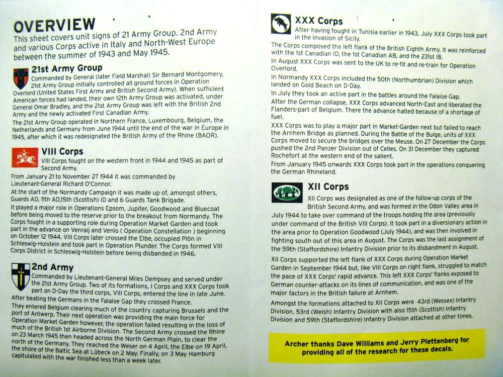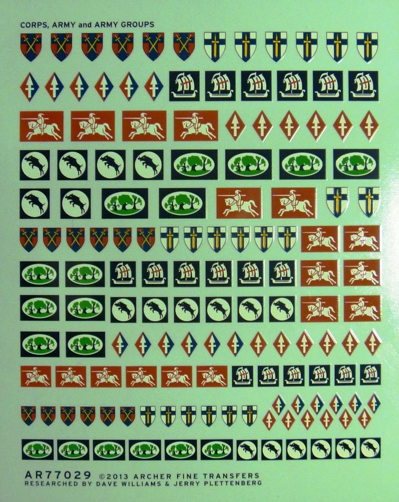 Mit zunehmender Anzahl an britischen Fahrzeugen des 2. Weltkrieges steigt auch der Bedarf an alternativen Markierungen. AFT Decals, eine Division von Archer Fine Transfers, liefert uns hier für den Maßstab 1:35 Nassschiebebilder von Abzeichen, wie man sie zwischen Sommer 1943 und Frühjahr 1945 an britischen Militärfahrzeugen konnte. Das Set beinhaltet je 6 Abzeichen in 3 verschiedene Größen für folgende Einheiten: - 21st Army Group Die Abzeichen sind gestochen scharf und ohne Versatz gedruckt. Der Trägerfilm ist so gut wie unsichtbar und so minimal, dass man sich randgenaues Ausschneiden getrost sparen kann. In einem englischsprachigen Beiblatt wird die Einsatzgeschichte jeder darstellbaren Einheit kurz erläutert. Ein weiteres Beiblatt erklärt detailliert die korrekte Anbringung von Nassschiebebildern auf dem Modell. Original Preis: US-$ 10,50. In Deutschland sind AFT Decals im Schnitt unter 10,00 Euro erhältlich. |