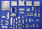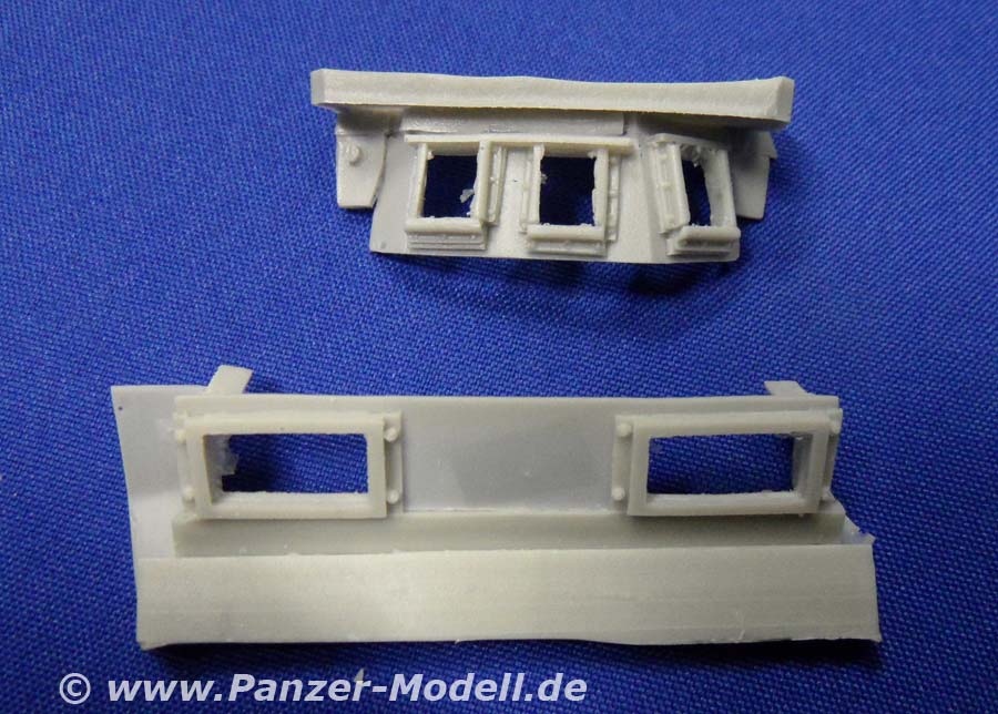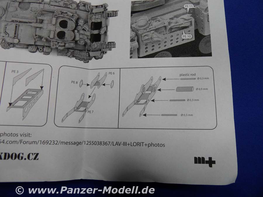 Was der geneigte Bastelfreund evtl. schon erraten hat ist folgendes: Dieser „Zubehörsatz“ ist wenn überhaupt ein ausgewachsener Umbausatz und von erstklassiger Qualität und Formtreue! Es enthält die großen Staukörbe an den Seiten der Wanne und um den Turm herum, die Schutzschilde auf dem Turm und um die hinteren Wannenluken, die T-Antennen, neuen Kabelschneider, die Ersatzradhalterung am Bug, diverses Gerödel und drei Wasserflaschen aus klaren Resin. Dazu gibt es eine Platine mit Ätzteilen für die Kanisterhalterungen und Zurrösen, sowie die Spannschlösser von Spanngurten (Tamiyatape oder Pflaster!?). Man braucht wohl nicht extra zu erwähnen, dass die Staukörbe voller Gerödel stecken und auch weitere Rucksäcke, Isomatten usw lose beiliegen. Insgesamt bleibt von der ursprünglichen Form nicht viel übrig! Dazu gibt es sowas wie eine Bauanleitung!!! Eine ganze DIN-A4 Seite mit Ansichten eines gebauten Modells und Zeichnungen zu den Ätzteilen!!! Wer Black Dog kennt weiß warum mich das so begeistert! Wer nicht kann es sich denken! Alles was man jetzt noch braucht, sind ein paar neue Resinreifen und evtl. noch den Trumpeter-Bausatz des LAV-III. Mit diesem Umbausatz hat man auch als Gelegenheitsmodellbauer die Möglichkeit einen Lorit zu bauen, da die Staukörbe als Ganzes in Resin gegossen sind und somit nicht wie sonst üblich aus Ätzteilen und Draht selbst hergestellt werden müssen. Und der Profi wird das Real Model Modell zur Seite legen und erleichtert durchatmen! Da die Staukörbe nach Wahl verteilt werden können lassen sich sogar zwei nebeneinander bauen, die nicht gleich aussehen! Super! Zur Qualität der Teile gibt es nur eins zu sagen: Perfekt! Urmodellbauer und Gießer verstehen ihr Handwerk! Nicht ein Detail nicht vorhanden. Keine Luftblasen. Null Verzug. Perfekt eben! Fazit: Wem der normale LAV-III zu langweilig ist, dem sei zu diesem Set geraten! Besser geht nicht (bis auf die „Anleitung“ vielleicht)!