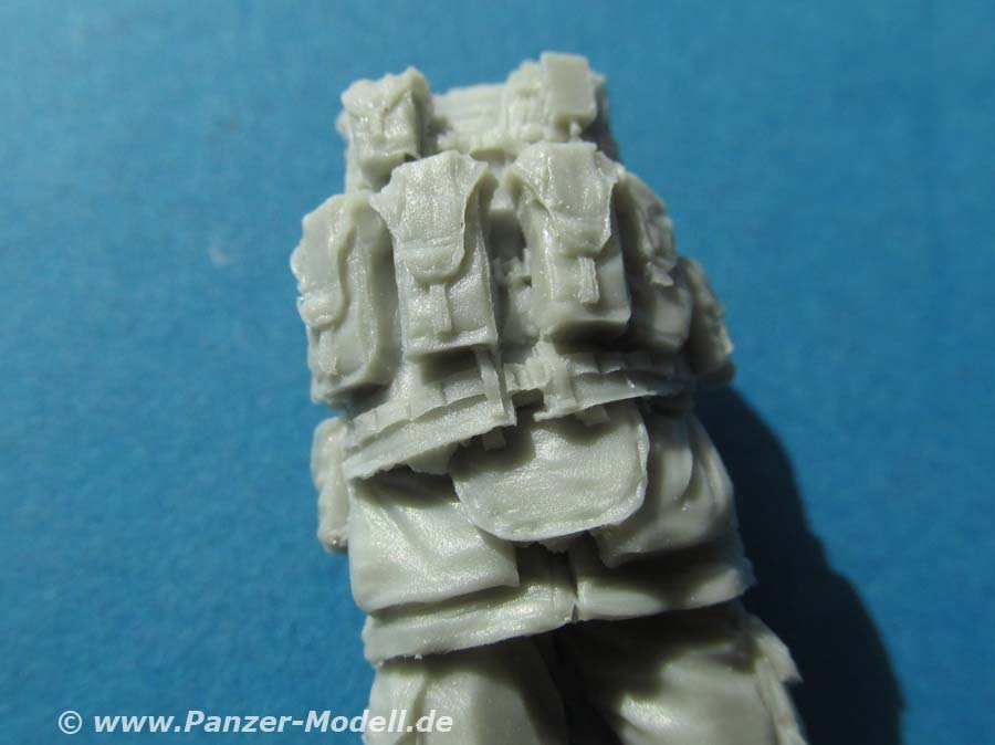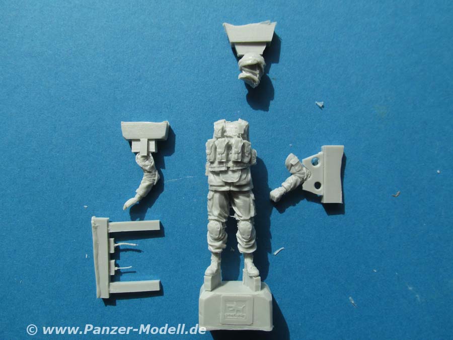 Die Figur ist in feinster Qualität fehlerfrei gegossen und weist wieder unglaublich tolle Details auf. Der Körper ist in einem Stück gegossen und daran Ausrüstung wie Weste und Magazintaschen mit Hinterschneidungen und Details, dass es eine helle Freude ist. Auch der Faltenwurf der Kleidung und die Knie- und Ellbogenschoner sind einfach grandios dargestellt.