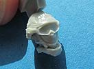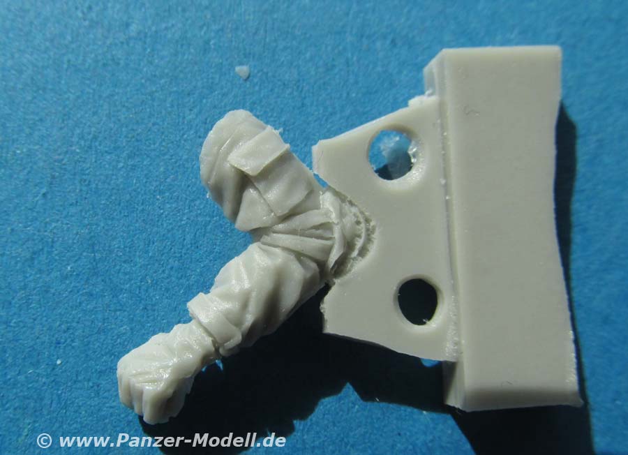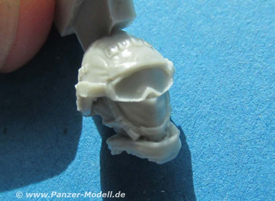 Auch der Kopf mit Helm ist gut dargestellt, wobei das Gesicht durch die augesetzte Schutzbrille zur Hälfte verdeckt ist und unter den Brillenflächen keine Details modelliert sind ... das widerum gefällt mir nicht sooo gut, denn so muss man durch bemalung die darunterliegende Augenpartie andeuten statt die Brille mit klarem Resin auszufüllen.