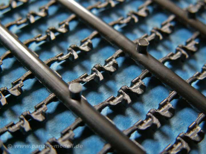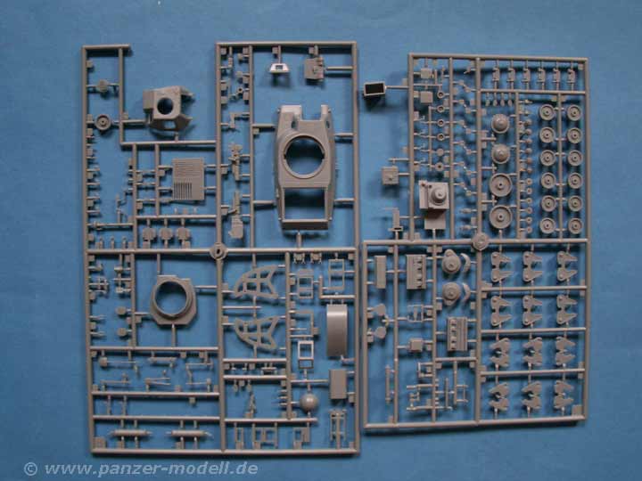Die Spritzgussteile sind durch die Bank schön detailiert, die Frontpartie weist eine sehr feine Gussstruktur auf und auch für den Innenraum gibt es eine Einrichtung wie Fahrerplatz, Getriebe, Antriebswelle, Bodenplatte, usw. mit guten Details. Gut finde ich die Beigabe eines Motors für den Motorraum, damit dieser durch die Lüftungsschlitze nicht so leer aussieht! Ebenfalls gut ist die Verwendung einer Einzelgliedkette, auch wenn diese durch ihre kleinen Glieder sicher nicht einfach im Zusammenbau ist. Doch dadurch kann man die Kette besser anpassen und mit mehr Details versehen, als eine Vinylkette. Im Gegensatz zu den Trumpeter Modellen ist hier die Länge im ganzen korrekt wiedergegeben.