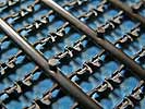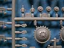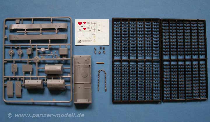 Der Karton beinhaltet einige schöne Spritzgussteile, die schon auf den ersten Blick gefälliger wirken, als das Pendant von Trumpeter. Es handelt sich um insgesamt 5 Spritzlinge von denen zwei die Einzelgliedketten beinhalten. Dazu die Wanne als Einzelteil, 6 kleine Federn, ein Metallrohr und ein schöner, kleiner Decalbogen.