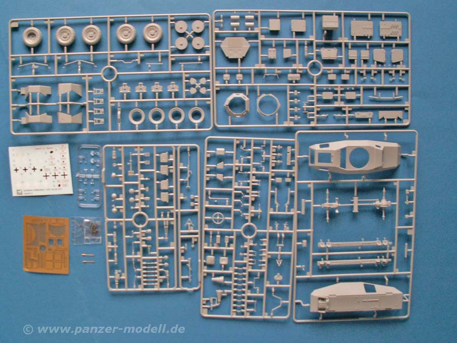 Im Karton finden sich über 200 Teile an 5 Spritzlingen, ein Spritzling mit durchsichtigem Plastik, eine Platine PE Teile, 10 Metallfedern in 2 Größen, Peilstangen aus Metall und ein Decalbogen.