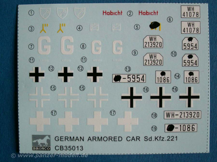 Der Decalbogen ist sauber gedruckt und gibt die Möglichkeit der Markierung von 4 verschiedenen Fahrzeugen - dabei muss ich anmerken, dass für den deutschen markt einige der Decals mit schwarzem Filzstift zensiert wurden. Das schränkt die Markierungsmöglichkeiten auf zwei Fahrzeuge ein.
