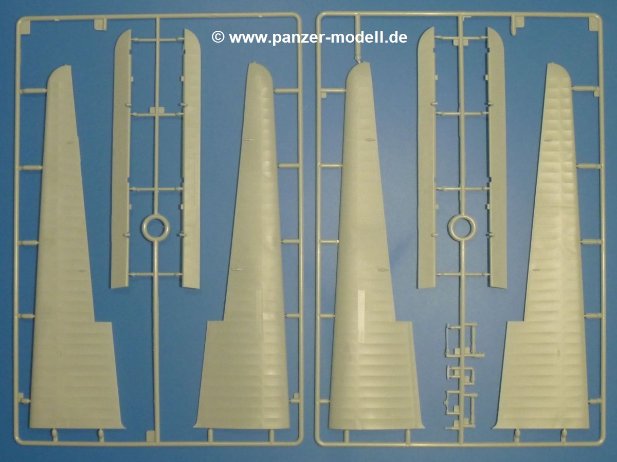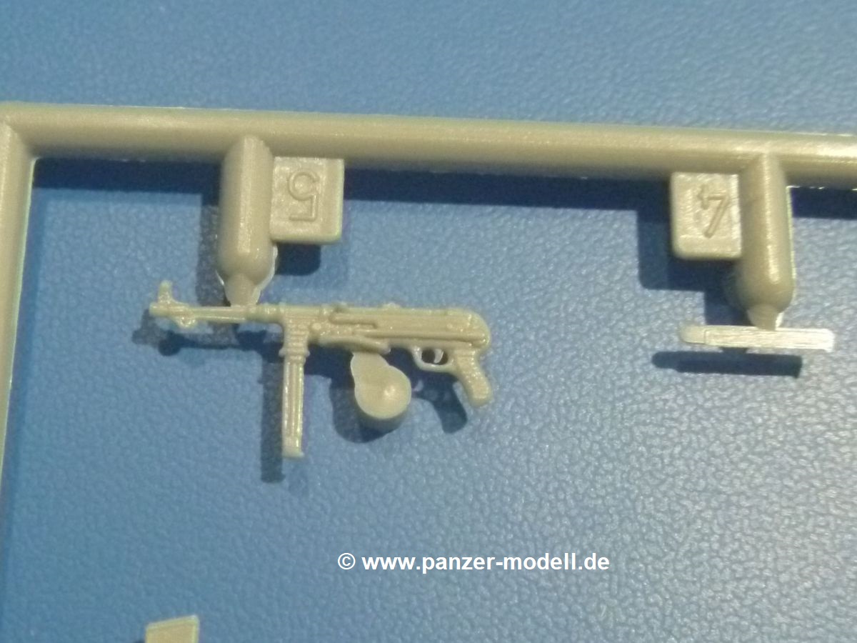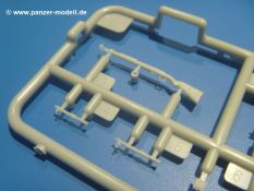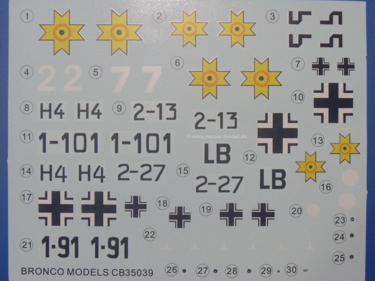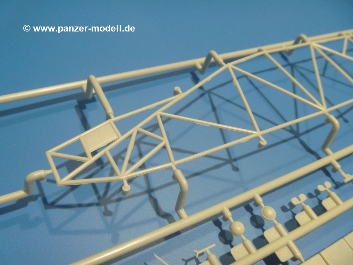 Alle Teile sind sauber gespritzt. Hier und da ist etwas feiner Grat (an Verstrebungen, Höhenruder) zu finden. Auswerferspuren befinden sich auf später nicht oder kaum einsehbaren Teilen. Die Klarsichtteile sind kristallklar, ohne Schlieren oder Einschlüsse. Die Figuren stammen zwar aus 20 Jahre alten Formen, aber weisen genügend Details und einen schönen Faltenwurf der Uniformen auf. Nur die Gesichter sind etwas zu einheitlich (Man könnte ganz sim(m)pel meinen: „Alle Menschen werden Brüder ...").Das Original hat Bronco wenig Chancen gelassen, filigrane Kleinstteile zu produzieren. So sind die kleinsten und feinsten Teile im Pilotenbereich zu finden. Auch das Fla-MG ist sehr filigran, aber der Rest sollte auch Anfänger nicht abschrecken.Im Inneren gibt es die Bodenplatte, die sowohl Pilotensitz, Steuerhorn und Fußsteuerung für die Querruder aufnimmt. Dahinter kommt die Sitzbank für die 9 Soldaten. Sie besteht aus den Bodenstreben, Sitzpolster und Rückenlehnen. 3 Karabiner, bei denen man die Wahl zwischen 2 Verschlüssen hat, werden im vorderen, rechten Bereich platziert. Der Rumpfkäfig besteht aus 2 Seiten-, 1 Boden- und 1 Deckenteil. Hier wird man sauber arbeiten müssen, damit die Streben beim Zusammenfügen der Rumpfhälften sauber zusammenkommen. Rumpf und Tragflächen zeigen bei näherem Hinschauen die Struktur des Bespannungsmaterials. Viele Seitenfenster, Cockpit- und 2 Einstiegsöffnungen rechts und links erlauben gute Einsicht ins Innere. In der rechten Rumpfhälfte und der linken Einstiegstür kann man weilweise Öffnungen für zusätzliche Fenster ausschneiden. Die linke Tür zeigt auch innen Verstrebungen an, aber dafür finden sich hier auch 4 Auswerferspuren in den Ecken, die man verspachteln sollte, wenn man die Tür offen anbringt. Für die großen Tragflächen wird eine stabile Aufnahme in den Rumpf eingeschoben, so dass kaum Last auf den dünnen Stützstreben liegen sollte. Jede Tragfläche besteht aus je Ober-, Unterteil und dem jeweils zweiteiligen Querruder. Der Pilotenbereich weist am meisten Details auf, die auch bei geschlossener Cockpithaube gut zu sehen sein werden. Auch durch die großen Seitenfenster im Fußbereich erhält man guten Einblick. Bedienhebel, Steuerhorn, Leuchtpatronenhalter (?) und die Armaturentafel, die mit 8 Decals ihr wahres Aussehen erhält, sind Details des Cockpits. Der Bug wird mit einer einfache Bugnase verschlossen. Darunter befindet sich Aufnahme für das Schleppseil. Die Landekufe wird an 3 Federbeinen angebracht, die durch den Rumpf bis zur Bodenplatte reichen. Am Heck findet sich nur ein einfacher Sporn. Für die wahlweise Startkonfiguration gibt es ein einfaches Fahrgestell, bestehend aus Quer-, Stützstreben und den beiden Rädern. Die Speichen der Radfelgen sind zwar da, kommen mir aber etwas vereinfacht vor. Der DFS-230 B1 war der erste seiner Art, der mit einem MG zur Selbstverteidigung ausgerüstet war. Das MG samt Halterung und Trommelmagazin sind dabei. Das MG erscheint mir etwas zu filigran, aber im Vergleich mit Originalaufnahmen doch wieder richtig. Damit der Schütze nicht versehentlich ins Cockpit schießen konnte, wird ein Abweiserbügel angebracht.Ein Figurensatz (Dragon Nr. 6094) mit 4 Fallschirmjägern erweitert den Bausatz. Der Satz besteht aus 1 stehenden, 2 laufenden und einen im Aufstehen begriffenen Fallschirmjäger. Ausrüstungsgegenstände wie die typischen Fallschirmjägerhelme, Brotbeutel, Feldflasche, Essgeschirr, Klappspaten, Munitionstaschen etc. und Waffen wie eine MP40 und ein Fallschirmjägergewehr 42 sind dabei. Die Waffen werden durch den Dragon Satz Nr. 6003 ergänzt. Dieser enthält eine weitere MP40, 1 Fallschirmjägergewehr 42, 2 Karabiner und Magazine.Der Decalbogen liefert neben den Instrumenten Decals Optionen für 4 Luftwaffe und 2 rumänische Lastensegler:
