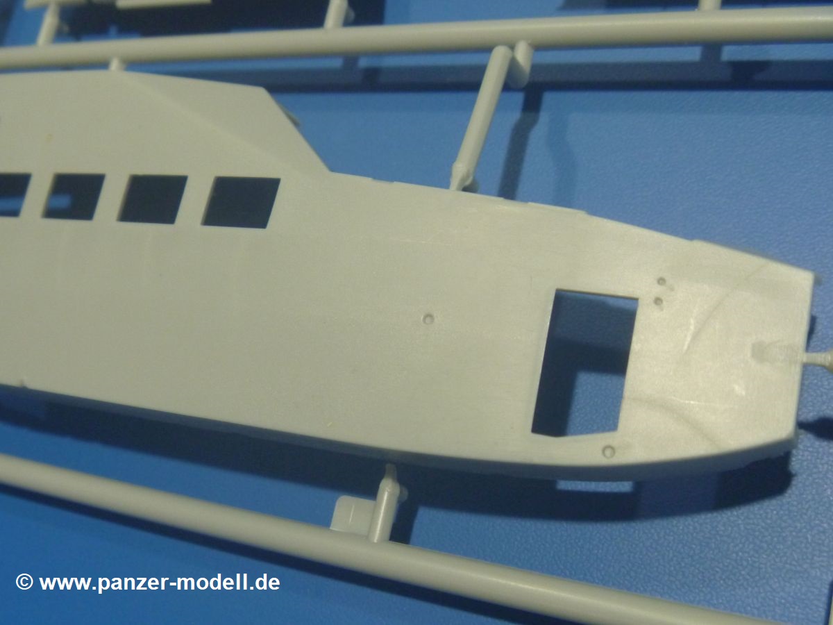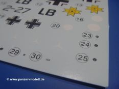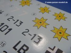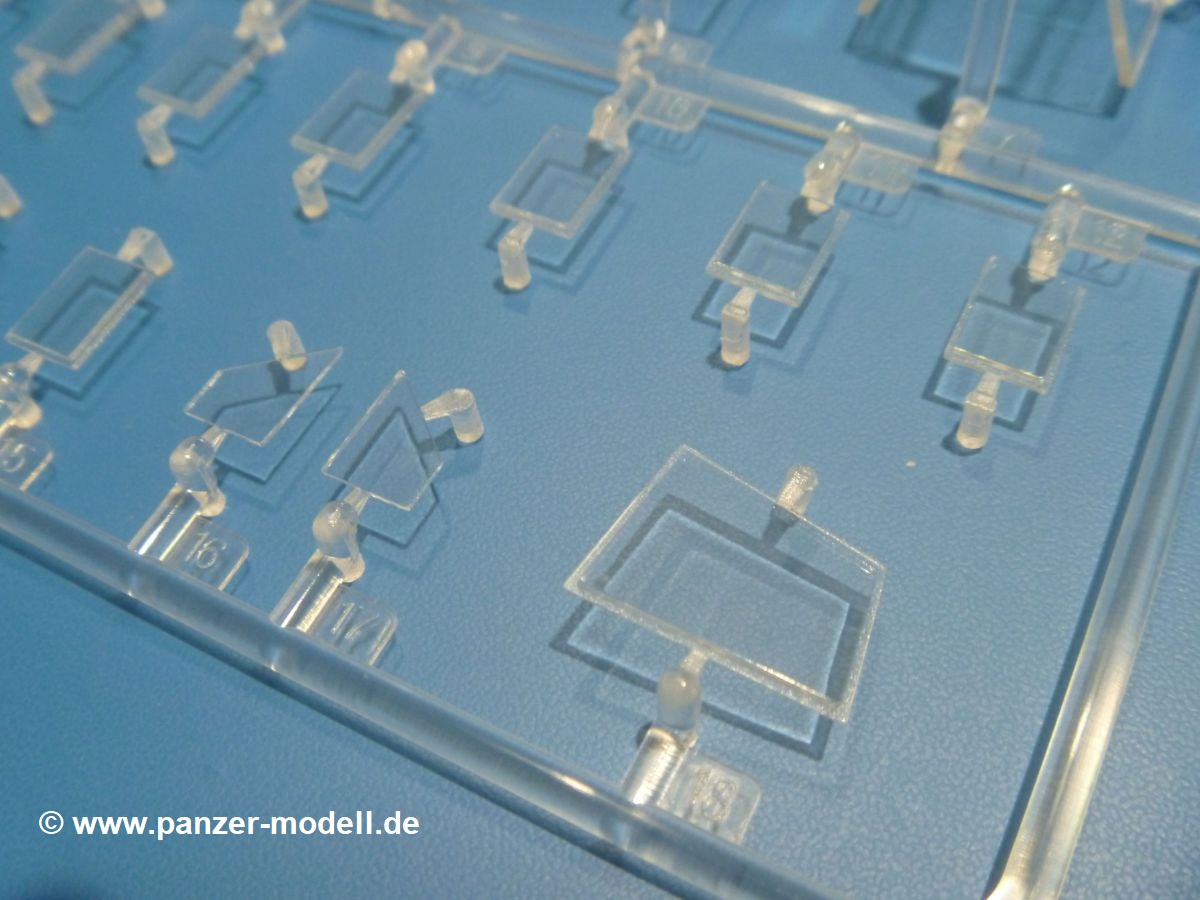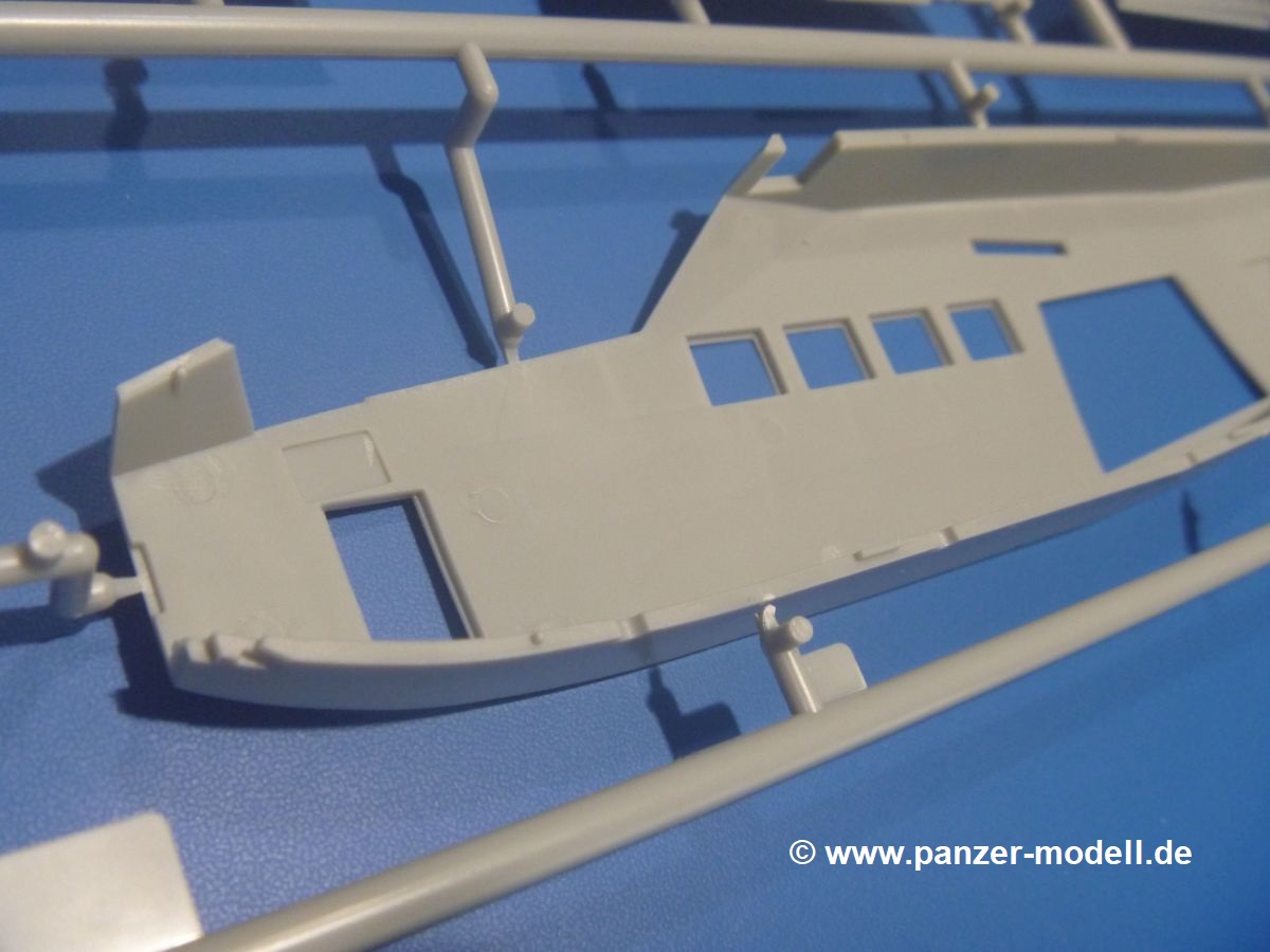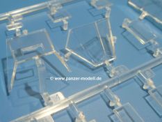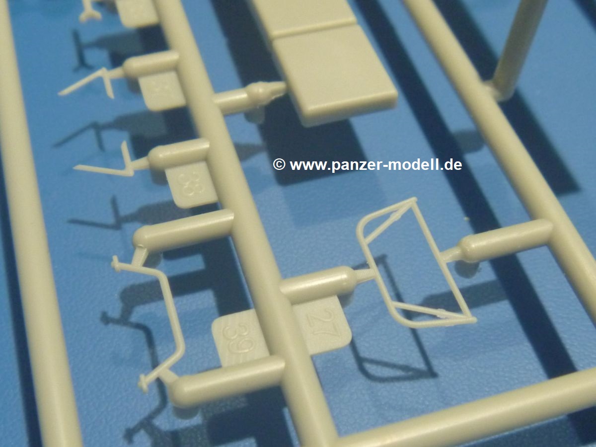 Alle Teile sind sauber gespritzt. Hier und da ist etwas feiner Grat (an Verstrebungen, Höhenruder) zu finden. Auswerferspuren befinden sich auf später nicht oder kaum einsehbaren Teilen. Die Klarsichtteile sind kristallklar, ohne Schlieren oder Einschlüsse. Die Figuren stammen zwar aus 20 Jahre alten Formen, aber weisen genügend Details und einen schönen Faltenwurf der Uniformen auf. Nur die Gesichter sind etwas zu einheitlich (Man könnte ganz sim(m)pel meinen: „Alle Menschen werden Brüder ...").Das Original hat Bronco wenig Chancen gelassen, filigrane Kleinstteile zu produzieren. So sind die kleinsten und feinsten Teile im Pilotenbereich zu finden. Auch das Fla-MG ist sehr filigran, aber der Rest sollte auch Anfänger nicht abschrecken.Im Inneren gibt es die Bodenplatte, die sowohl Pilotensitz, Steuerhorn und Fußsteuerung für die Querruder aufnimmt. Dahinter kommt die Sitzbank für die 9 Soldaten. Sie besteht aus den Bodenstreben, Sitzpolster und Rückenlehnen. 3 Karabiner, bei denen man die Wahl zwischen 2 Verschlüssen hat, werden im vorderen, rechten Bereich platziert. Der Rumpfkäfig besteht aus 2 Seiten-, 1 Boden- und 1 Deckenteil. Hier wird man sauber arbeiten müssen, damit die Streben beim Zusammenfügen der Rumpfhälften sauber zusammenkommen. Rumpf und Tragflächen zeigen bei näherem Hinschauen die Struktur des Bespannungsmaterials. Viele Seitenfenster, Cockpit- und 2 Einstiegsöffnungen rechts und links erlauben gute Einsicht ins Innere. In der rechten Rumpfhälfte und der linken Einstiegstür kann man weilweise Öffnungen für zusätzliche Fenster ausschneiden. Die linke Tür zeigt auch innen Verstrebungen an, aber dafür finden sich hier auch 4 Auswerferspuren in den Ecken, die man verspachteln sollte, wenn man die Tür offen anbringt. Für die großen Tragflächen wird eine stabile Aufnahme in den Rumpf eingeschoben, so dass kaum Last auf den dünnen Stützstreben liegen sollte. Jede Tragfläche besteht aus je Ober-, Unterteil und dem jeweils zweiteiligen Querruder. Der Pilotenbereich weist am meisten Details auf, die auch bei geschlossener Cockpithaube gut zu sehen sein werden. Auch durch die großen Seitenfenster im Fußbereich erhält man guten Einblick. Bedienhebel, Steuerhorn, Leuchtpatronenhalter (?) und die Armaturentafel, die mit 8 Decals ihr wahres Aussehen erhält, sind Details des Cockpits. Der Bug wird mit einer einfache Bugnase verschlossen. Darunter befindet sich Aufnahme für das Schleppseil. Die Landekufe wird an 3 Federbeinen angebracht, die durch den Rumpf bis zur Bodenplatte reichen. Am Heck findet sich nur ein einfacher Sporn. Für die wahlweise Startkonfiguration gibt es ein einfaches Fahrgestell, bestehend aus Quer-, Stützstreben und den beiden Rädern. Die Speichen der Radfelgen sind zwar da, kommen mir aber etwas vereinfacht vor. Der DFS-230 B1 war der erste seiner Art, der mit einem MG zur Selbstverteidigung ausgerüstet war. Das MG samt Halterung und Trommelmagazin sind dabei. Das MG erscheint mir etwas zu filigran, aber im Vergleich mit Originalaufnahmen doch wieder richtig. Damit der Schütze nicht versehentlich ins Cockpit schießen konnte, wird ein Abweiserbügel angebracht.Ein Figurensatz (Dragon Nr. 6094) mit 4 Fallschirmjägern erweitert den Bausatz. Der Satz besteht aus 1 stehenden, 2 laufenden und einen im Aufstehen begriffenen Fallschirmjäger. Ausrüstungsgegenstände wie die typischen Fallschirmjägerhelme, Brotbeutel, Feldflasche, Essgeschirr, Klappspaten, Munitionstaschen etc. und Waffen wie eine MP40 und ein Fallschirmjägergewehr 42 sind dabei. Die Waffen werden durch den Dragon Satz Nr. 6003 ergänzt. Dieser enthält eine weitere MP40, 1 Fallschirmjägergewehr 42, 2 Karabiner und Magazine.Der Decalbogen liefert neben den Instrumenten Decals Optionen für 4 Luftwaffe und 2 rumänische Lastensegler: