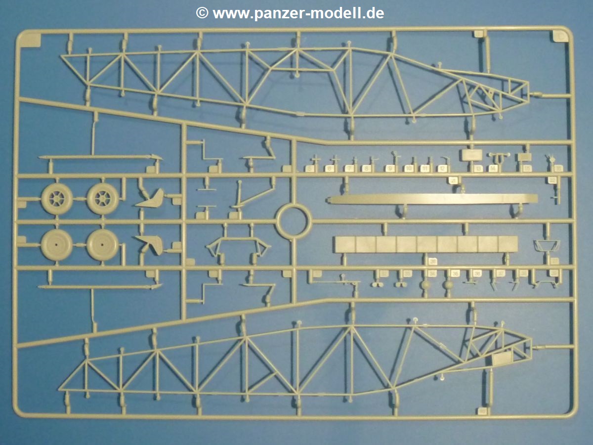 Das Original: So ab Mitte der 1930-er entwickelte die Deutsche Forschungsanstalt für Segelflug einen Lastensegler für 1 Piloten und 9 Soldaten, der ab 1939 unter der Bezeichnung DFS-230 in der Spielzeugfabrik Robert Hartwig in Serienproduktion ging. Zwischen 1939 und 1944 wurden bei Hartwig und anderen Werken über 1.600 Stück gebaut. Er war 11,24 m lang und die Spannweite betrug 20,87 m. Leer wog er 860 kg und konnte mit Zuladung ein Startgewicht bis 2.100 kg erreichen.Die erfolgreiche Feuertaufe erlebte der DFS-230 am 10. Mai 1940 bei der Eroberung des belgischen Forts Eben-Emael. Der größte Einsatz von Lastenseglern auf Kreta stellte sich wegen der großen Verluste als Desaster heraus, dennoch wurde er weiterhin in Afrika und an der Ostfront für den Nachschub eingesetzt.Einige Originalaufnahmen sind bei WikiMedia Commons zu finden.Der Bausatz: Bronco hat uns ja bereits 2 Lastersegler Bausätze des Horsa beschert. Als dann der DFS-230 angekündigt wurde, war die Freude entsprechend, aber man musste doch etwas Geduld aufbringen. Nun ist er endlich da. Werfen wir mal einen Blick in den 450 x 300 x 70 mm großen Karton: