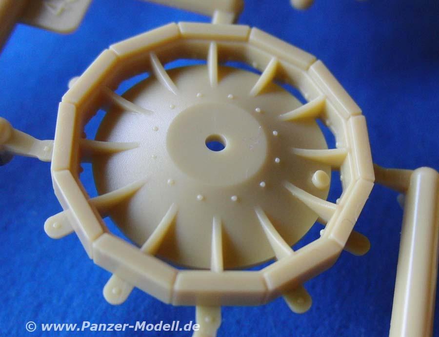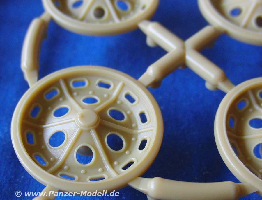 Die Laufrollen sehen sehr gut aus und für die Vorderreifen hat Bronco sogar zwei Versionen beigelegt, die für die frühe und späte Version mit schönem, unterschiedlichen Profil daherkommen. Leider fehlt es gier an Herstelleraufdrucken.