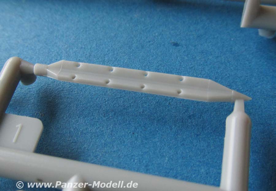 Neu ist der Lafettenaufsatz auf dem der Rheinbote dann sitzt und abgeschossen wird. Diese Startrampe ist mit Nieten übersät, die allesamt sauber und scharf sind. Die Oberseite ist mit einer Laufschiene versehen in der der Rheinbote eingeklinkt ist.