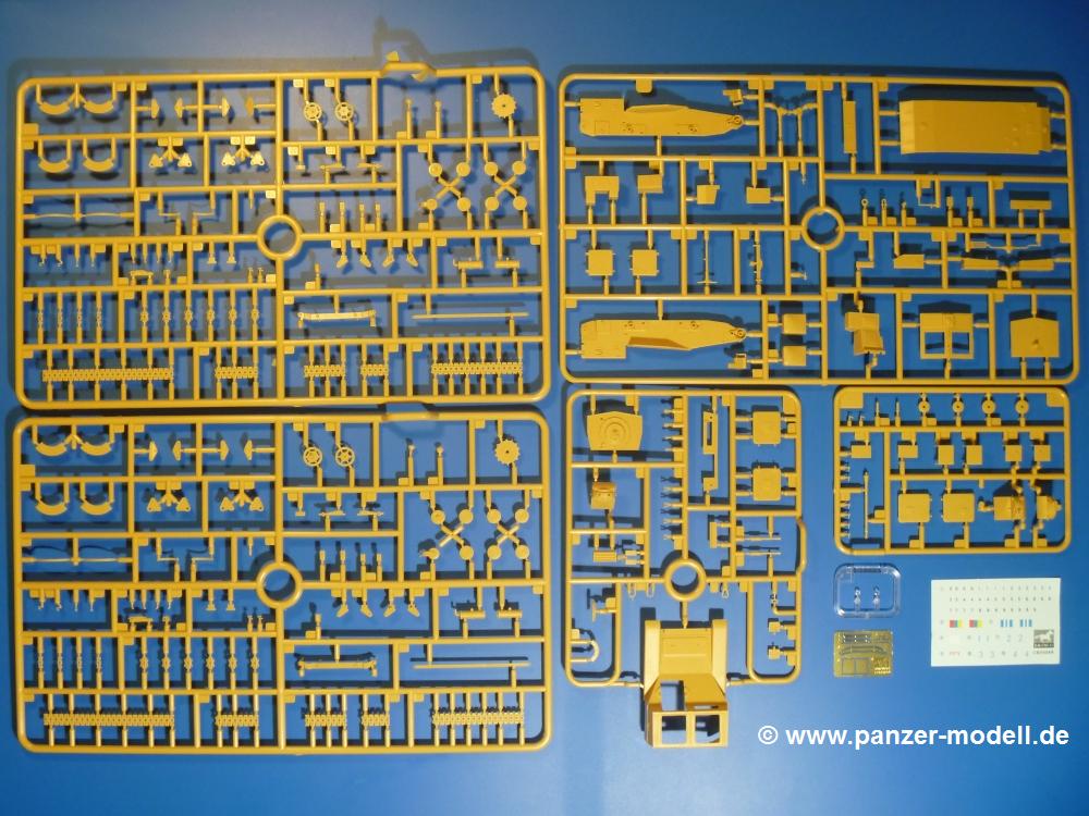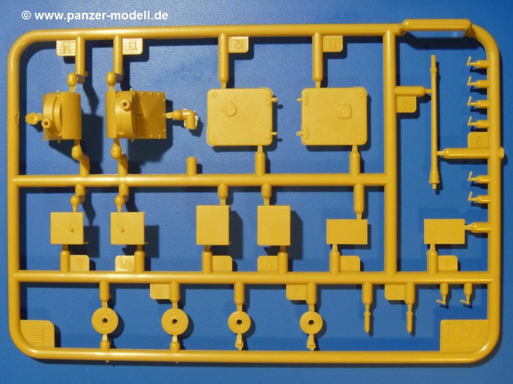 Das Original: Die Carro Armato CV33 war eine kleine 2-Mann Tankette, die von Fiat/Ansaldo auf Basis der britischen Carden Loyd Mk. VI Tankette entwickelt und 1933 in Produktion ging. Sie war zur Infantrieunterstützung und Aufklärung gedacht. Anfangs war sie nur mit einem 6,5 mm Maschinengewehr, später mit einem 6,5 mm Zwillingsmaschinengewehr ausgerüstet. Zusammen mit anderen Änderungen führte dies zur Umbenennung in L35. Schnell stellte man fest, dass die MG Bewaffnung zu schwach war, so dass manche im Feld auf 20 mm Solothurn S18-1100 Kanonen umgerüstet wurden. Sie sahen 1941 ihren Einsatz in Nordafrika. Etliche wurden von den Briten erbeutet. Der Bausatz: Bronco hat uns ja schon einige CV33 Bausätze beschert. Hier kommt nun eine abweichende Variante mit 20 mm Kanone.Im Karton finden wir 5 ockergelbe Spritzlinge, 1 Spritzling mit den Klarsichtteilen, eine Ätzteilplatine, einen Abziehbilderbogen (Decals) und eine 12-seitige Bauanleitung im A4 Format.Die Spritzlinge sind wie folgt aufgeteilt: