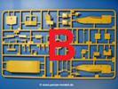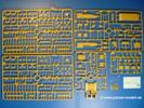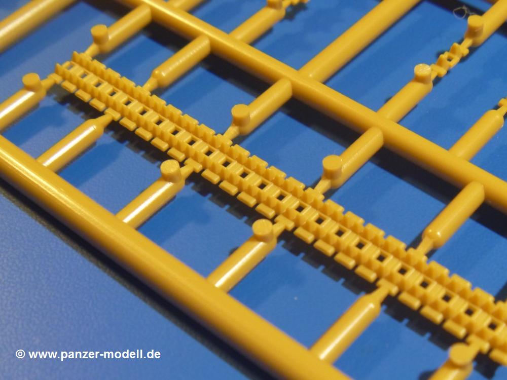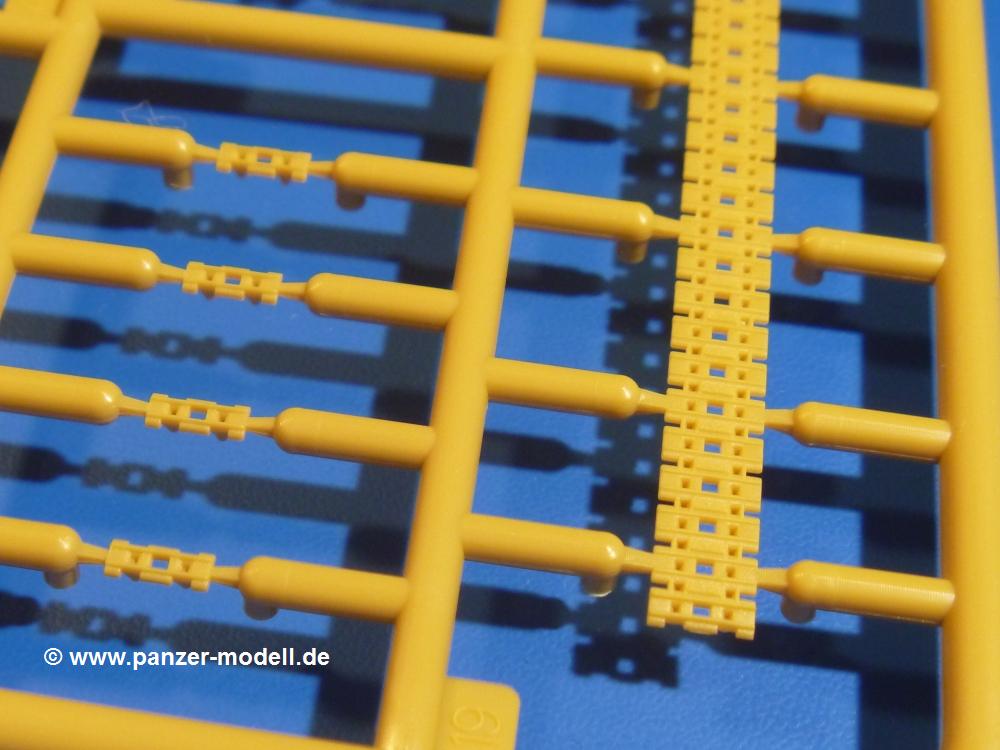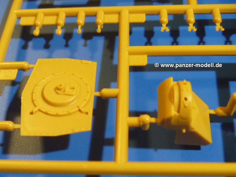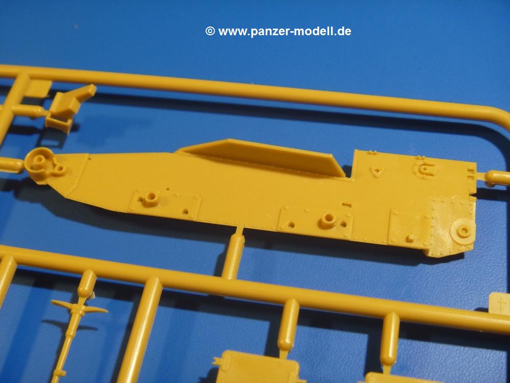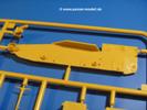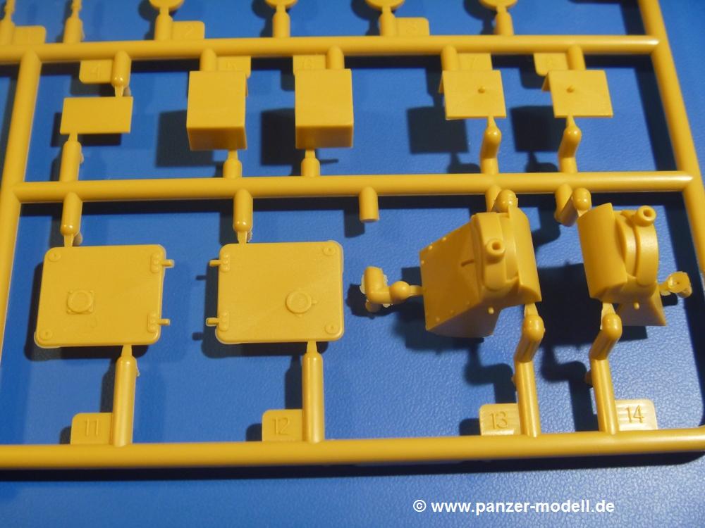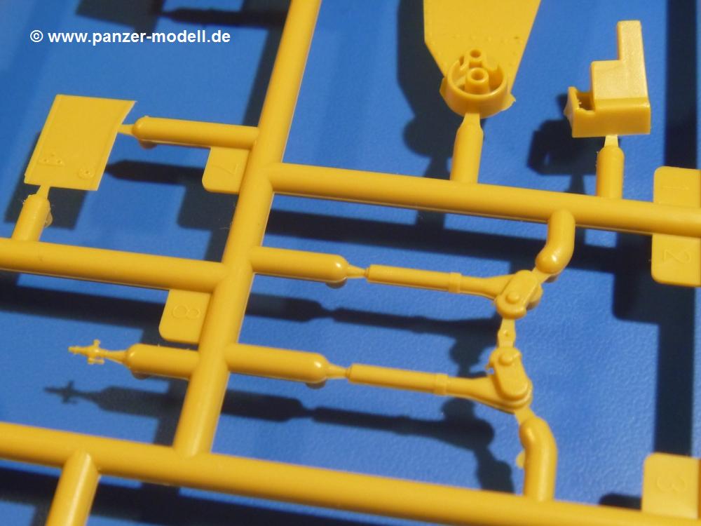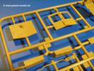 Alle Teile sind, wie bei Bronco üblich, sauber gespritzt, ohne Sinkstellen, Versatz, Fischhäute oder nennenswerten Grat. Einige Auswerferspuren sind zu finden, die sich zumeist an verdeckten Stellen befinden.Die Spritzlinge kennt man größtenteils aus den Vorgängerbausätzen. Man braucht nur nicht alle Teile. Spritzling F enthält die Teile für die Kanonenversion.Die Unterwanne setzt sich aus 6 Teilen zusammen. Entsprechende Passstifte sorgen dafür, dass alles gut zusammen kommt. Jede Menge Nieten und Schraubenköpfe sind zu finden. Auch die Bodenplatte ist damit versehen und zeigt zudem noch einige Wartungsdeckel.Das Fahrwerk des Winzlings dürfte die meiste Arbeitszeit in Anspruch nehmen, denn jeder der 4 Laufrollenwagen ist in 11 Teile aufgebrochen. Der Kettenspanner, das Spann- und schöne Speichenleitrad, machen noch mal 8 Teile, Antriebszahnrad und Achse 4, Kettenstützbalken und Halterung 4 und die Verbindung der Laufrollenwagen untereinander und mit der Wanne noch mal 2 Teile aus. Die grad mal 5,5 mm schmale Kette besteht pro Seite aus 5 größeren, 6 Dreiersegmenten und 4 Einzelgliedern. Bei den Ersatzrollen vom Spritzling F hat man die Wahl, diese entweder direkt an den Wannenseiten anzubringen oder man verwendet an den Stellen die Batteriekästen, auf die die Ersatzrollen aufgesetzt werden.Das Motordeck zeigt feine Lüftungsrippen, die Motorklappen erhalten feine, separate Flügelschrauben und können geschlossen oder offen dargestellt werden. Letzteres macht aber nicht viel Sinn, denn im Gegensatz zu den anderen CV33 Bausätzen bleibt der Motorraum leer. So erklärt sich auch der erheblich günstigere Preis. Auch der Kampfraum bleibt ohne Innenausstattung. Geöffnete Kampfraumklappen lohnen sich nur, wenn man beabsichtigt Figuren dort einzusetzen, denn sonst blickt man ins leere Innere. Statt der Zwillings-MG Blende kann man zwischen 2 Versionen der 20mm Kanonenblende wählen - glatt oder mit aufgeschraubter Zusatzpanzerung. Die Blende kann man höhenrichtbar einbauen, eine Seitenrichtung des schönen Kanonenrohrs mit ansatzweise aufgebohrter Mündung ist nicht vorgesehen.Bei den äußeren Anbauteilen sind der Wagenheber mit separater Kurbel und die Spitzhacke noch die grössten Teile. Die beiden Auspufftöpfe bestehen aus je zwei Hälften und befinden sich jeweils an den Heckseiten. (PS: Als Schalldämpfer sind diese Töpfe wohl nicht gedacht, denn die L35 brummt wie ein Großer. Siehe und höre hier: TANKETTE ITALIANO MOD.35) Winzige Schlepphaken und -ösen wollen noch an ihren Platz. Auch die Fahrscheinwerfer mit schönen Glaseinsätzen protzen nicht mit Größe.Der Decalbogen erlaubt 5 verschiedene Fahrzeuge: