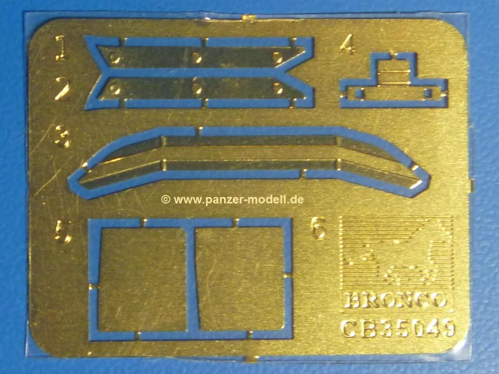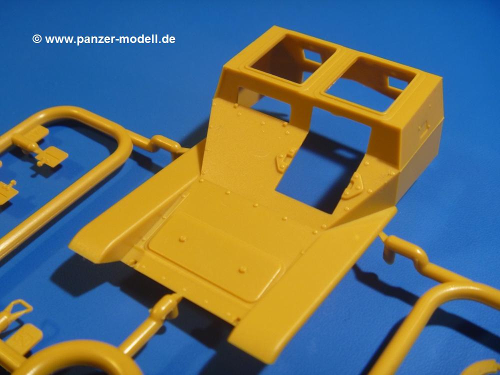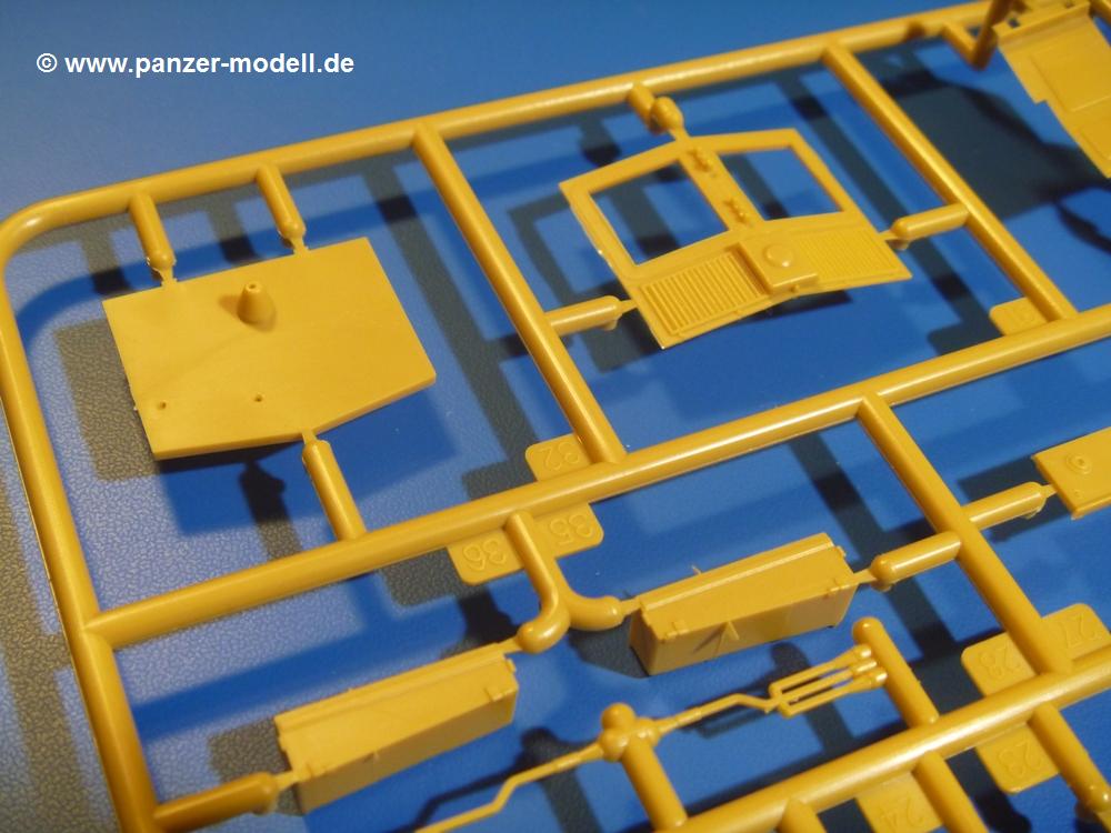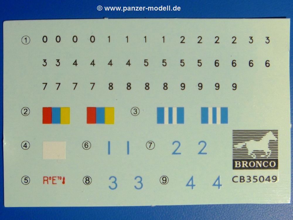 Das Fahrzeugkennzeichen setzt man aus dem weißen Grunddecal, der roten Regio Escercito Schrift und frei wählbaren, schwarzen Zahlen zusammen. Die Bauanleitung gibt allerdings für alle Decaloptionen das gleiche Kennzeichen an.Die teils farbige Bauanleitung erklärt den Zusammenbau in 17 Schritten. Dabei sind öfter zusätzliche Bilder zu finden, die die Anbringung mancher Teile etwas mehr verdeutlichen. Informationen zur Entwicklung und der Verwendung des Fahrzeugs in Englisch und Chinesisch, sowie die Farbangaben bei Verwendung von Mr. Hobby, Hobby Color, Humbrol und Tamiya Farben finden sich gleich am Anfang, gefolgt von einer Spritzlingübersicht. Grund- und Detailbemalung füllen die letzten Seiten.Ein Bausatz von guter, bekannter Bronco-Qualität. Verwöhnt durch die ersten Bausätze mit Motor- und Kampfraumausstattung fehlen mir die Innereien, andere mögen ggfs. froh darüber sein. Dafür ist der Preis um ca. 15,- EUR günstiger. Auf alle Fälle eine nette Variante, die nicht in der Sammlung fehlen sollte.