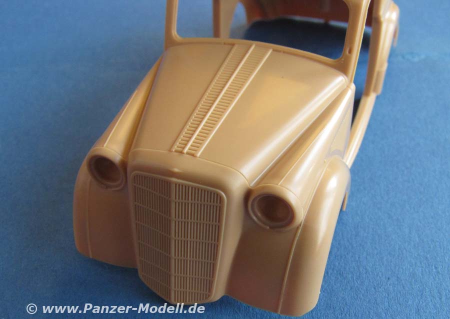 Der Aufbau ist quasi in einem Stück, sodass nur noch Türen, Fenster und kleinere Anbauteile angeklebt werden müssen und weist dabei schöne Details und eine verzugsfreie Form auf. Der Kühlergrill ist aus Plastik und trotzdem mit sehr feinen, guten Lamellen dargestellt.