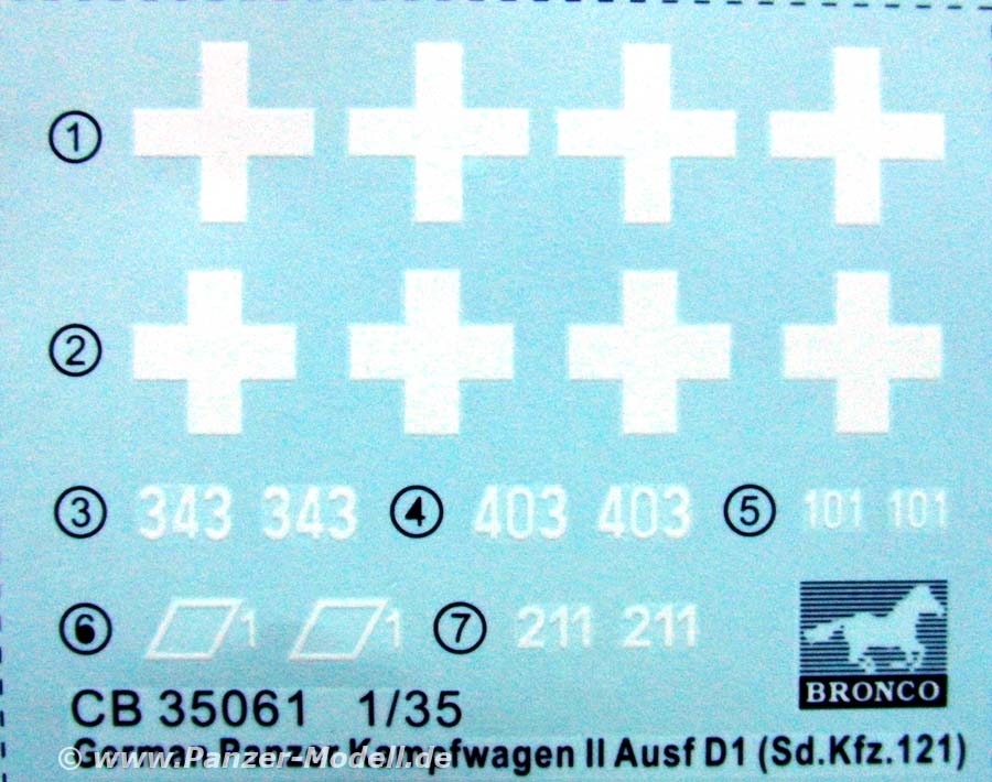 Die Ausf.D ist ein kleiner Exot in der Panzer II Baureihe da hier ein komplett anderes Laufwerk verwendet wurde. Erfreulicherweise unterscheidet Bronco hier sogar zwischen der Version D1 und D2, die sich minimal Bei Leitrad, Treibrad und der Kette unterscheiden.