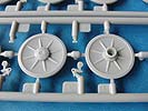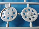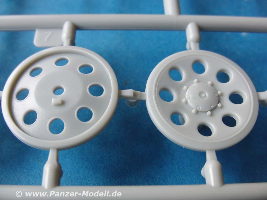 Das Laufwerk wird mit funktionierender Drehstabfederung und Schwingarmen dargestellt, sodass sich dieses ggf. auf einer unebenen Bodenplatte anpassen lässt. Das Schachtellaufwerk ist mit den verschiedenen gerippten und gelochten Laufrollen sehr gut dargestellt. Diese sind sauber und ohne Fehler gespritzt, dabei aber leider mit je Angüssen an den Laufflächen, d.h. ordentliches Versäubern ist angesagt.