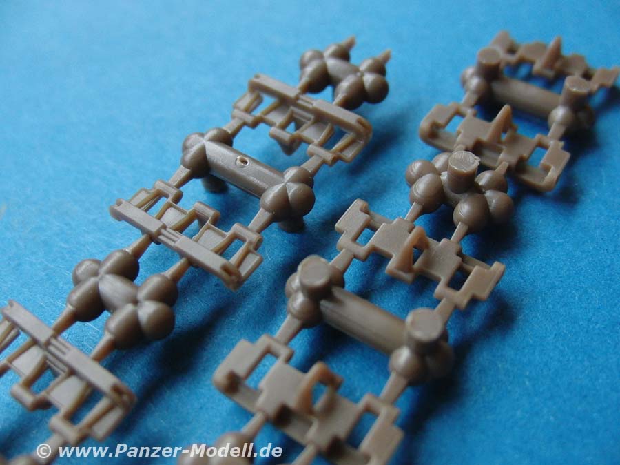 Die Kette stellt sich als bewegliche Einzelgliedkette dar, wobei die Kettenglieder noch vom Anguss getrennt werden müssen und dann mit zwei einzelnen Steckbolzen zusammen gesteckt werden. Eine etwas undankbare Aufgabe - aber für eine bewegliche Kette eine der wenigen Möglichkeiten. Und die Kettenglieder sehen hammermäßig aus - sauber, feine, scharfe Details und vor allem keine einzige Auswerferstelle! Für den Kettenzusammenbau liegt eine Montagehilfe bei, auf der die Kettenglieder einfach und schnell korrekt zusammengesteckt werden können.