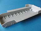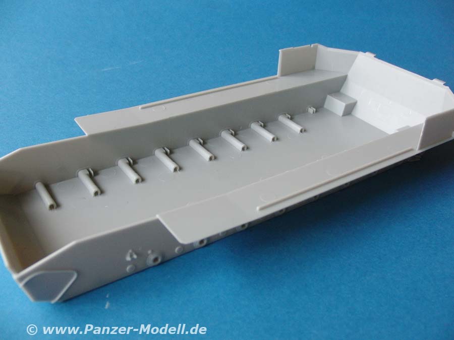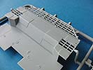 Dei Unterwanne wird durch eine Bodenplatte mit Ausschnittsbasis für die FlaK abgeschlossen, die mit vielen schönen Luken und Strukturen aufwartet und im erhöhten Heckbereich mit Lüftergrätings ausgestattet ist. Für diese liegen PE teile zur feineren Detaillierung der Lüftergitter bei.