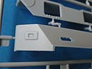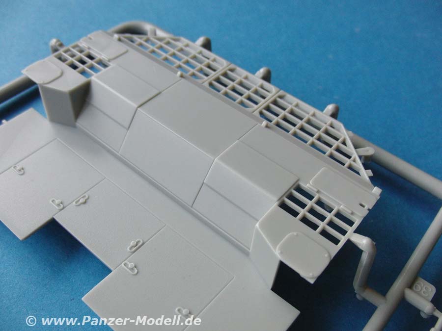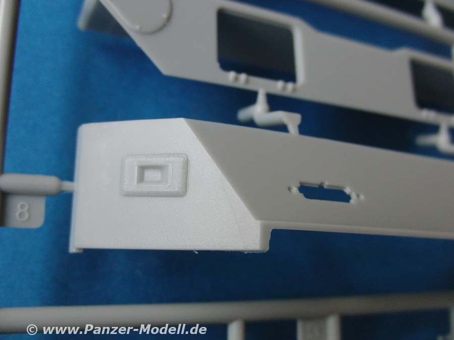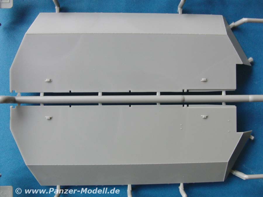 Die großen Seitenschilde und Heckschild sind ebenfalls exzellent dargestellt und bei der Größe auch ohne Verzug. Auch diese werden mit einigen PE Teilen versehen. Diese sind wahlweise hoch- oder abgeklappt anbaubar.