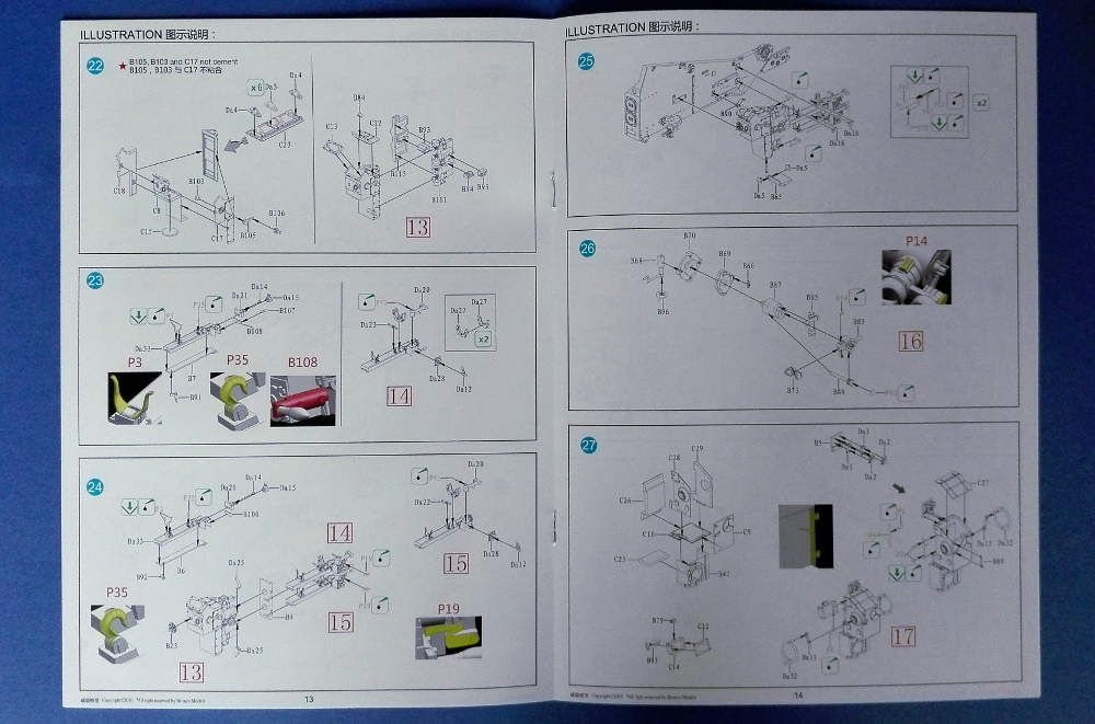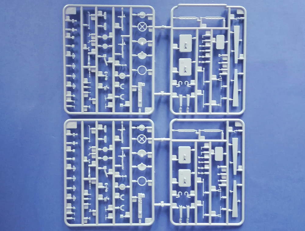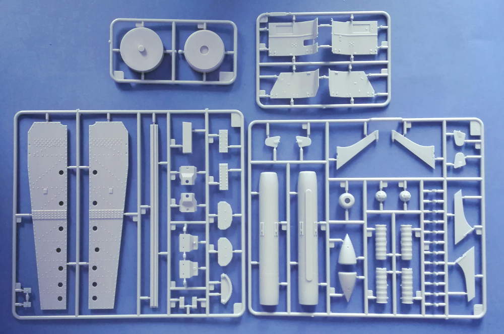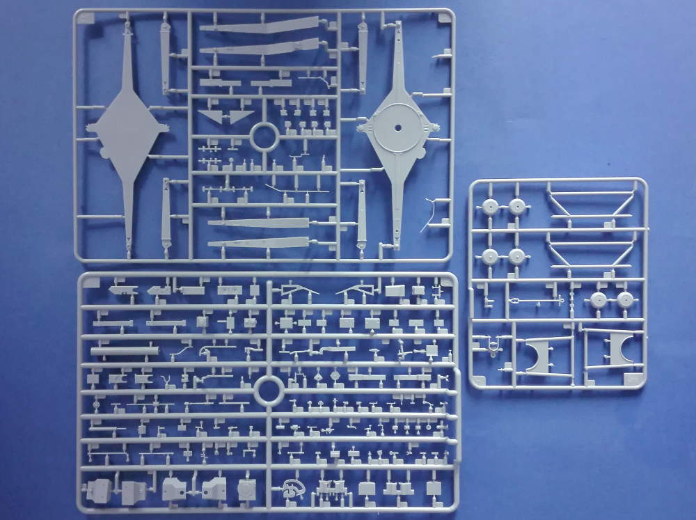 Der Bausatz besteht aus 13 Spritzrahmen in hellgrauem Kunststoff, zwei kleinen Platinen mit PE-Teilen und einem kleinen Decalsheet. Die Fertigungsqualität befindet sich auf sehr hohem Niveau, um nicht zu sagen perfekt! Die Anleitung im DIN A4 Format führt in, manchmal nicht sehr übersichtlichen, Baustaufen zum Ziel. Es besteht die Möglichkeit das Modell mit einer Rakete auf dem Transportkarren oder eben direkt mit der Rakete auf der Lafette darzustellen. Der Bausatz ist ausgezeichnet detailliert, viele sehr filigrane Bauteile tragen dazu bei. Aber der hohe Detaillierungsgrad kommt auch zustande durch einzelne Baugruppen, die dann aus einer Vielzahl von Kleinteilen bestehen. Man könnte es schon fast als „Bauteil-Wahnsinn“ bezeichnen. Ein Umstand, der mich persönlich bei Bronco Models schon immer etwas gestört hat. Etwas verwundert hat mich das Deckelbild des Bausatzes. Abgesehen von dem Schutzschild weist es erstaunliche Ähnlichkeit zu dem bereits im Jahr 2014 erschinenen Bausatz der Rheintochter R-3 von Customscale auf. Auch einer der Bemalungsvorschläge in der Anleitung scheint sich sehr stark an den Produktfotos von Customscale zu orientieren. Mir liegt der R-3 Bausatz von Customscale leider nicht vor, sonst hätte man vielleicht noch einen besseren Vergleich der beiden Bausätze ziehen können. Nichtsdestotrotz handelt es sich hier um einen richtig tollen Bausatz für ein sehr interessantes und außergewöhnliches Modell. Auch der Kaufpreis mit rund 32,- EUR geht für die gebotene Qualität absolut in Ordnung. Durch die Komplexität der einzelnen Baugruppen und den hohen Grad der Detaillierung ist es aber eindeutig ein Modell für den fortgeschrittenen und anspruchsvollen Modellbauer. Anfänger dürften mit diesem Kit schnell überfordert sein.