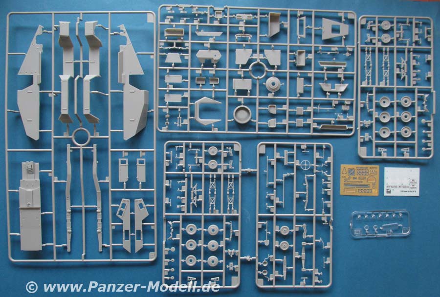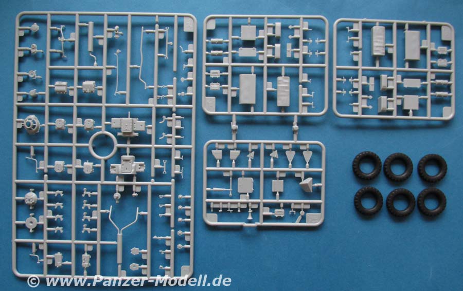 Im Karton finden wir 7 graue Spritzlinge, ein transparenter Spritzling, 6 Vinylreifen, eine PE Platine und ein Decalbogen.