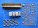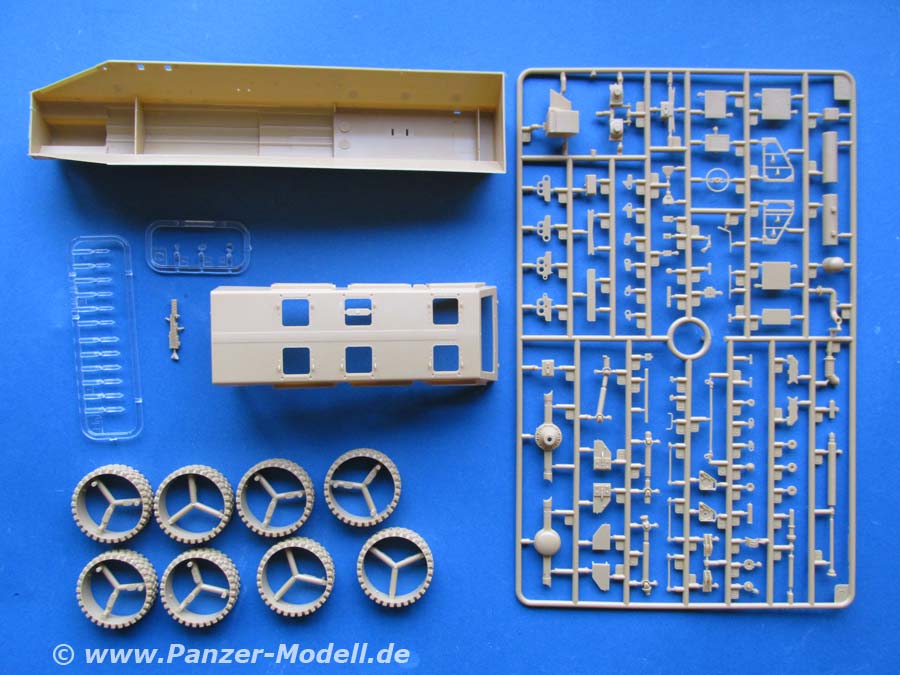 Im Bausatz finden sich 20 sandgelbe Spritzlinge, dazu 5 durchsichtige Spritzlinge, eine PE Platine, Schlauchmaterial, die unterwanne und der Aufbau, 8 Reifenprofilringe und ein Decalbogen.