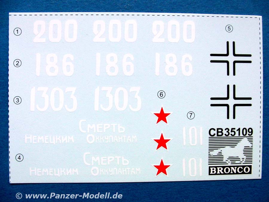 Der Decalbogen und die Bauanleitung bieten Markierungsvarianten für 5 verschiedene Fahrzeuge: