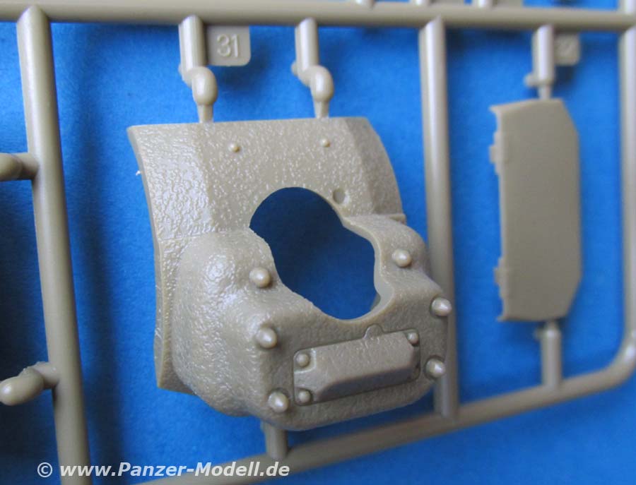 Der Turm mach auch einen exzellenten Eindruck mit toller Gusstruktur und einem recht detailliertem Innenleben der Kanone. Das Rohr ist aus Plastik und in einem Teil. Und man hat es sogar geschafft Felder und Züge vorn einzuarbeiten - für ein Plastikrohr wirklich schön. Auch die Blende mit ihrer ebenfalls rauen Struktur kann sich wirklich sehen lassen. Die Kommandantenluke lässt sich selbstverständlcih wahlweise offen oder geschlossen bauen.