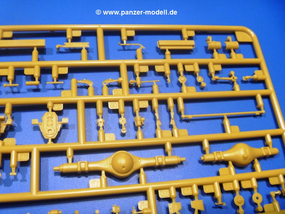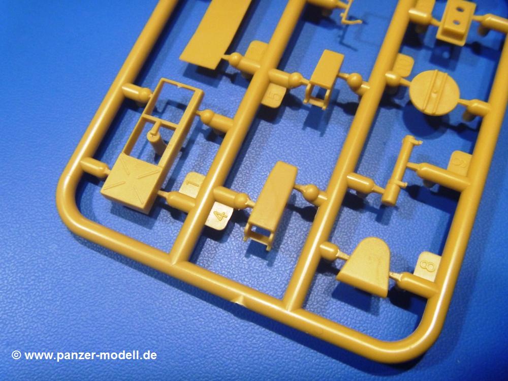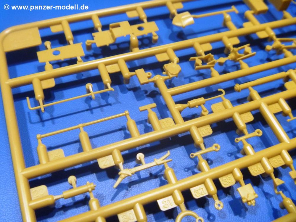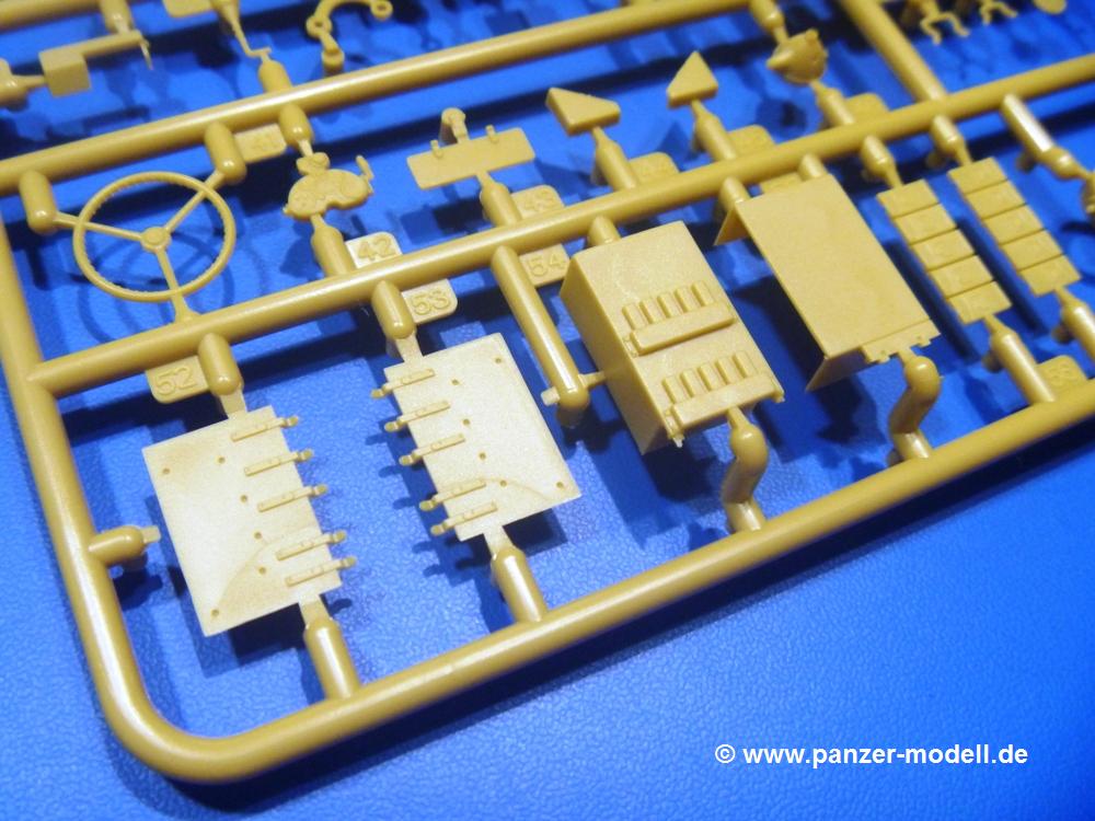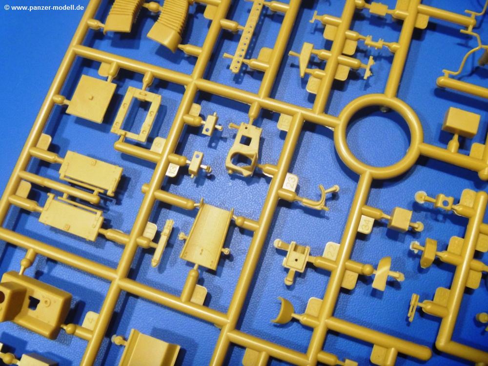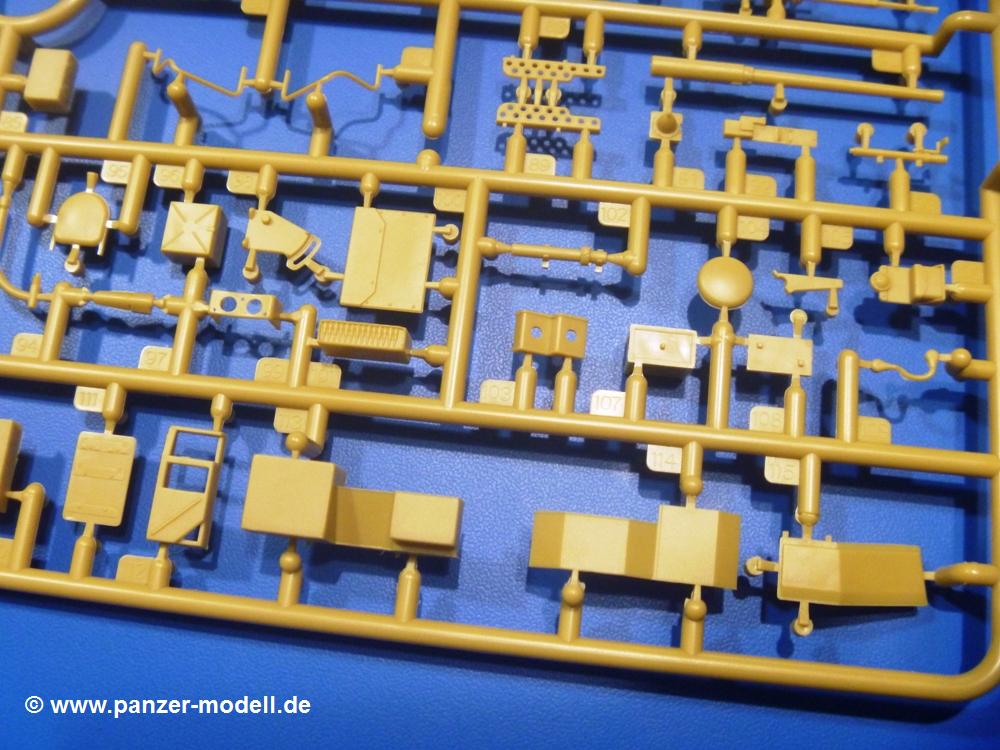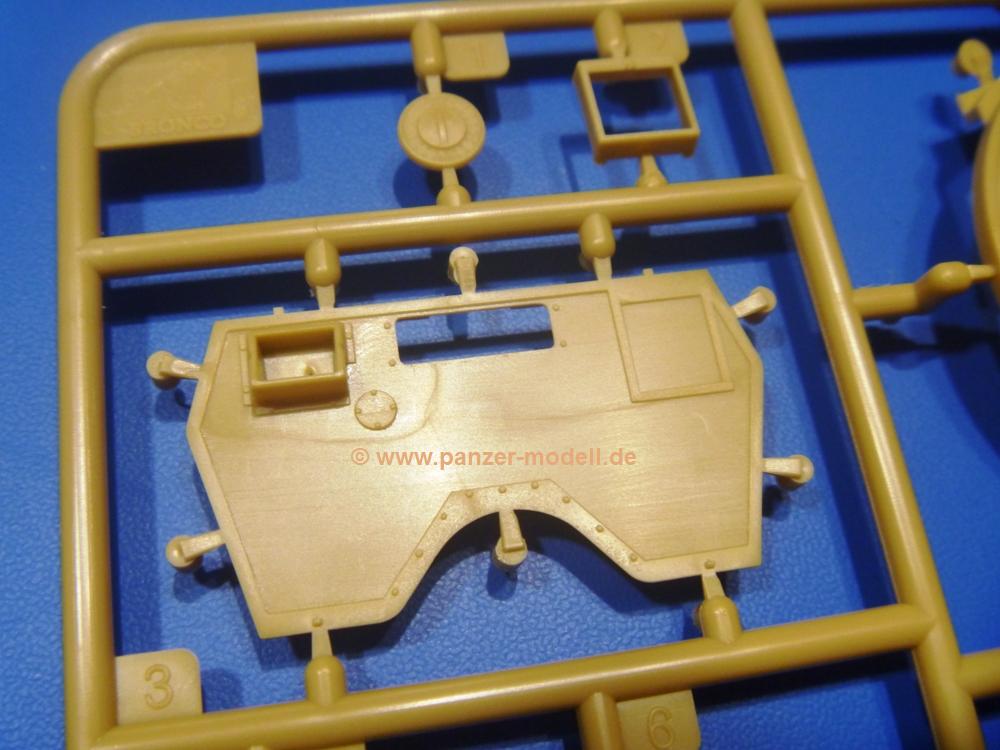 So, wie beschreibt man nun einen Bausatz der Superlative, ohne zu viel oder zu wenig zusagen? Beginnen wir beim Motor. Motorblock und Ölwanne sind selbstverständlich. Der Zylinderkopf ist mit feinen Verschraubungen versehen, Zündkerzenstecker sind angedeutet. Zuluft- und Auspuffkrümmer, Öleinfüllstutzen, Zündspule, Lichtmaschine (Generator), Doppelkeilriemen, -scheiben, Kühlventilator - alles da als separat anzubringende Teile. Allein die Lichtmaschine wird aus 6 Teilen zusammengesetzt und dazu gibt es auch den Keilriemenspanner. Der 6-teilige Kühler glänzt mit feinen Kühlrippen. Bronco hat die Schlauchverbindungen zum Motor nicht vergessen. Vergaser und Luftfilter bilden eine Einheit. Der Luftansaugschlauch führt zum Kampfraum, von wo der Motor sich seine Luft holt. An den Auspuffkrümmer schließt sich das Abgasrohr an, das in einem Schalldämpfer endet. Eigentlich fehlt nur die Verkabelung! An den Motor wird das Kupplungsgehäuse mit dem nachfolgenden Schaltgetriebe angeflanscht, das die Kraft über zwischengeschaltete Fliehkraftkupplungen an das Verteilergetriebe abgibt. Die Gimmicks hierbei sind, dass z.B. vom Allradschalthebel bis zum Verteilergetriebe das komplette Gestänge vorhanden ist. Man kann also am Modell die Verbindungen verfolgen. Vom Verteilergetriebe führen Kardanwellen zu den Achsen, deren Differentialgehäuse auch mit feinen Verschraubungen und Stützrippen ausgestattet sind. An der Hinterachse finden wir ein Bremsgestänge und einen extra Kontroll-/Einfüllstutzen für das Getriebeöl. Die Achsen ruhen auf Blattfederpaketen, die in ihre Lager ohne Klebstoff nur eingeschnappt werden, um die Beweglichkeit zu erhalten. Je Blattfederpaket gibt es noch einen Stoßdämpfer. Während die hinteren Stoßdämpfer sich an Lagern in Motorraum abstützen, bekommen die vorderen separate, außen an der Karosserie anliegende. Die großen Räder sind mehrteilig ausgeführt. Jedes Vorderrad besteht aus 9, jedes Hinterrad aus 6 Teilen! Zum einen dient dies der besseren Detaillierung, zum anderen um die Dreh- und Lenkbarkeit zu erreichen. Das komplette Lenkgestänge ist vorhanden und kann gemäß Anleitung funktionsfähig gebaut werden. Das "Rückgrat" des Fahrzeugs ist der Rahmen, der sich aus Längs-, Stütz- und Querträgern zusammensetzt. Für das Verteilergetriebe gibt noch mal einen mehrteiligen Hilfsrahmen, der in den eigentlichen Rahmen eingepasst wird. Auf dem Rahmen sitzt dann der Fahrzeugboden. Der Kampfraum wird vom Motor durch ein Brandschott getrennt. In dem Schott befindet sich eine Klappe, die geschlossen oder offen gebaut werden kann. Der Trick an der Klappe ist, dass die Besatzung durch sie hindurch greifen konnte, um den Ver-/Entriegelungsmechanismus der großen Motorklappe zu bedienen. Natürlich ist dieser Mechanismus vorhanden und kann aus 8 Teilen in geöffneter oder geschlossener Version gebaut werden. Lässt man die Motorklappe offen, wird man auch später noch sehen können, dass sich neben 2 Tanks auch noch Batteriekasten, Ölnachfüll- und andere Behälter im Motorraum befinden. Auch im Fahrerraum kann man sich austoben, dabei ist der Sitz noch das größte Teil. Schalt-, Feststellbrems- und Allradschalthebel sind vorhanden. Dies gilt auch für mehrteilige Pedalerie. Lenkrad, -stange, -getriebe inkl. Verbindungen zum Lenkgestänge sind da. Die Armaturentafel zeigt Details wie Lichtschalter und Instrumente (Laut Bauschritt 7 liegen Decals für die Instrumente bei. Dem ist aber nicht so!) plus eine Kartenleuchte. Der restliche Innenraum ist mit Feuerlöscher, Munitionskasten, -halterungen, Feldflasche, Leuchtpistole und einigem mehr ausgestattet. Die Seitensichtklappen sind einteilig, aber sehr schön detailliert, die Fahrersichtklappe dafür 14-teilig. Sie kann offen oder geschlossen gebaut werden. Die beiden Seitentüren können geöffnet oder geschlossen gebaut werden. Die rechte kann aber nur bei Option 1 mit dem Ersatzrad auf dem Bug geöffnet werden. Auch der Turm geht als eigenes Modell durch. Natürlich sind Waffen komplett und mit Munitionskästen und Hülsenfangsäcken, -kasten ausgestattet. 3 Sitze der Turmbesatzung, Turmseitenschwenkwerk, Handgranatenhalter aus PE Teilen mit separaten Handgranaten, Abfeuerungsmechanismus der 2 Nebelwurfrohre in der Blende, Seitensichtluken mit Öffnerhebel, Aufbewahrungskästen, Trommelmagazinhalterungen, Turmbelüftung und ein sehr schönes Funkgerät mit Schutzgitter und Verkabelung sind weitere Innendetails. Die Dachwinkelspiegel sind aus Klarsichtmaterial, werden aus mehreren Teilen zusammengesetzt und können gedreht eingebaut werden. Für die faltbaren Turmluken gibt es die Optionen offen oder geschlossen. Für den Suchscheinwerfer an der Turmfront gibt es eine Klarsichtscheibe. Die MG-Rohre sind bereits aufgebohrt, die Blende kann höhenbeweglich gebaut werden, bleibt aber beweglich, nur wenn man im Inneren die Hülsenfangsäcke weglässt oder durch flexibles Material (nicht im Bausatz enthalten) ersetzt. Weitere Details außen am Turm sind die durchbohrten Nebelwurfrohre, die Abdeckung des Turmlüfters, MG-Halterung samt MG und die Antennen. Außen am Fahrzeug finden sich Werkzeuge wie Schaufel, Brechstange, Hackenstiel und Wagenheber, Feuerlöscher, Außenspiegel, Hupe, Begrenzungsleuchten, Fahrscheinwerfer, Hebe- und Zurrösen, eine Halterung für ein Sandblech und dasselbige, verschiedene Stau-, Munitions- und Kraftstoffbehälter und das Ersatzrad. Die Anbringung der letzteren hängt von der Optionswahl ab. Das Abschleppseil aus dem beiliegenden Bindfaden wird mittels 2 Haken in die seitlichen Haltegriffe eingehängt. Der Decalbogen liefert die Außenmarkierungen für vier Fahrzeuge. Es fehlen die Instrumentenanzeigen und die Plaketten für Kästen und Feuerlöscher, die in die Bauschritten zwar angegeben sind, aber nicht auf dem Bogen erscheinen. Varianten:
